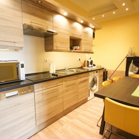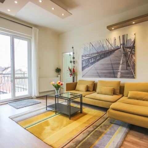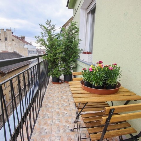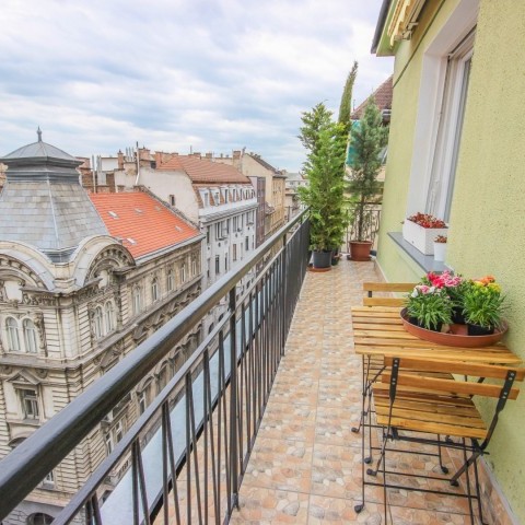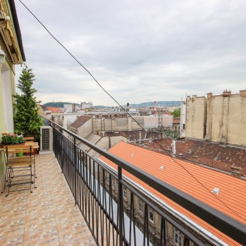 61 m2 top floor apartment with a 24m2 balcony around the apartment with a view to Gellert hill and the Buda Castle is for long term rent in the 7th district. The apartment consist a bedroom, a living room, kitchen with dining area, bathroom and hall. The apartment was fully renovated 2 years ago. It is airconditioned and the kitchen is fully equipped (washing maching with a dryer, fridge, freezer, washing machine and microwave oven). Both lighting and electrical equipments are A+, ++ or +++. Hot water and heating is centrally provided, heating is measured. Monthly rental fee is EUR 1300 including common costs. Usage of water, electricity and heating is paid on actual usage. 2 month deposit is requested.