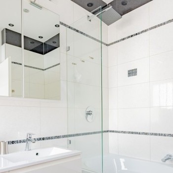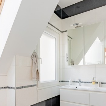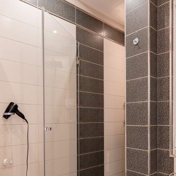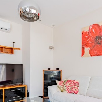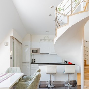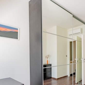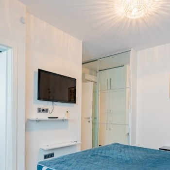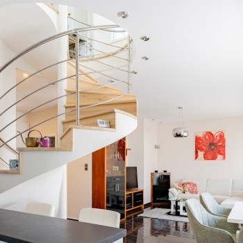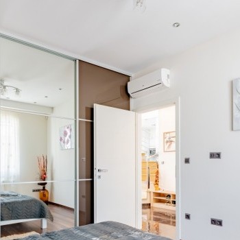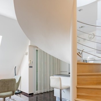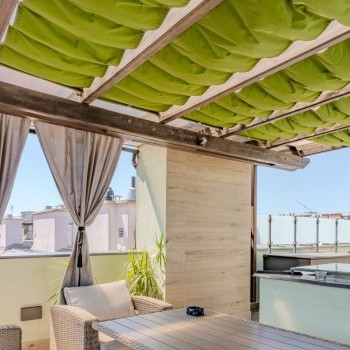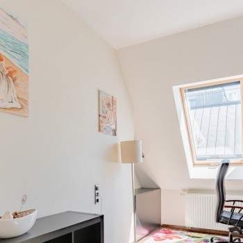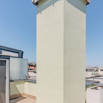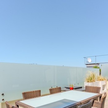 The apartment has a living room-kitchen-dining room 3 bedrooms, one bathroom with shower and one with bathtub, 2 smaller balconies and one 34 sqm rooftop terrace.