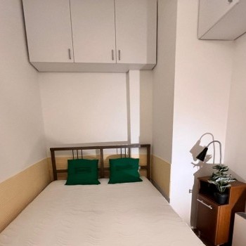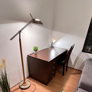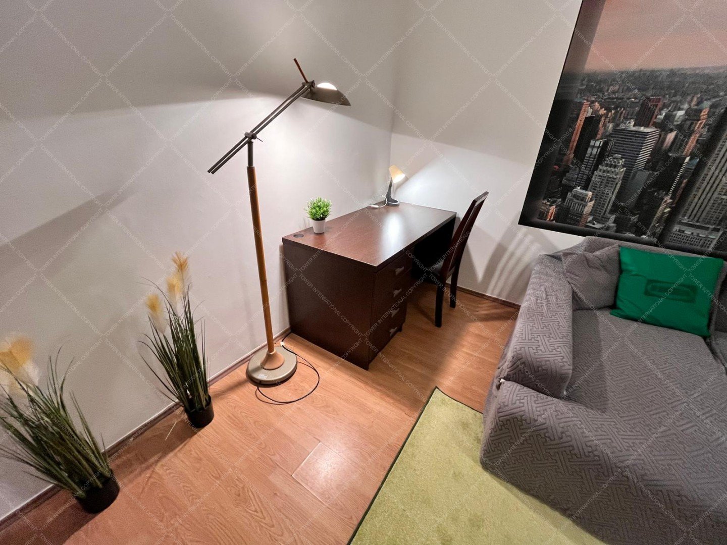 Furnishings. The living room has a sofa, a large wardrobe, a desk with a chair, a bedside table and a coffee table. The kitchen is also fully furnished.