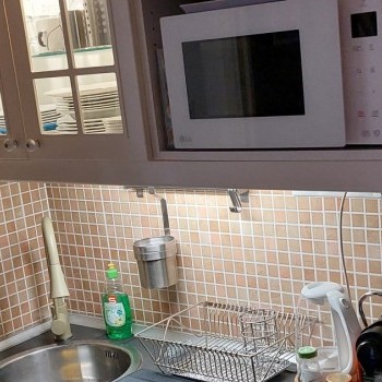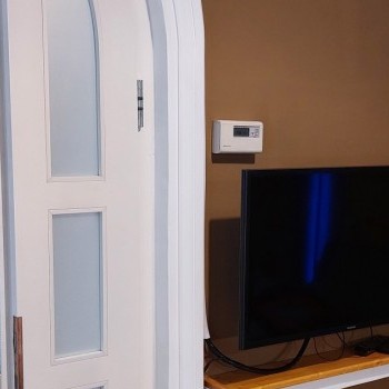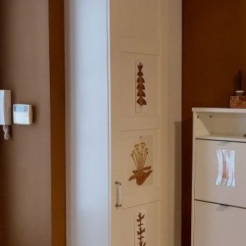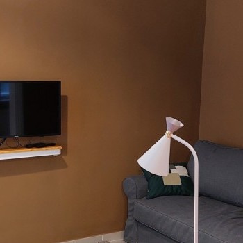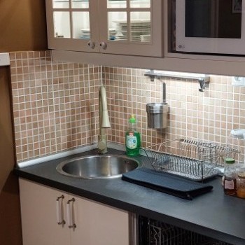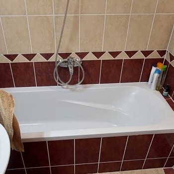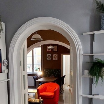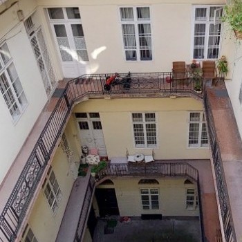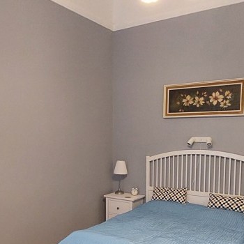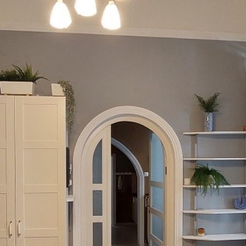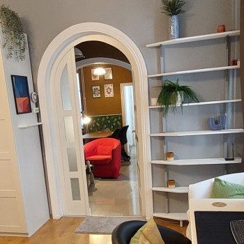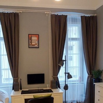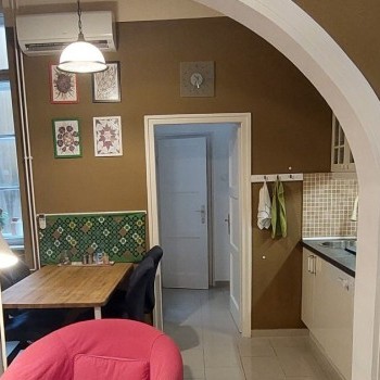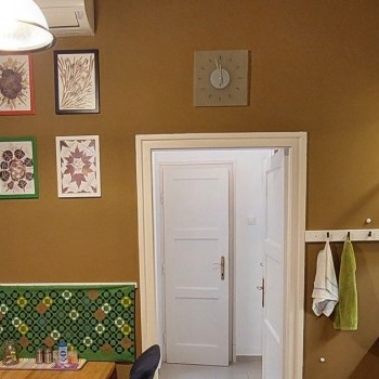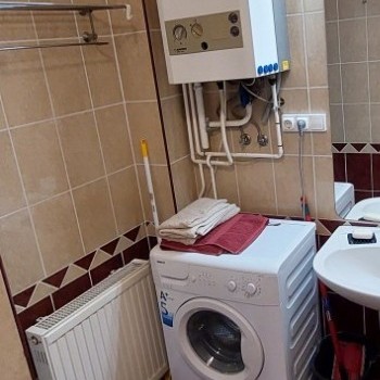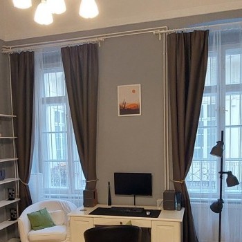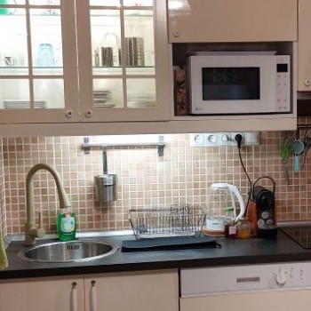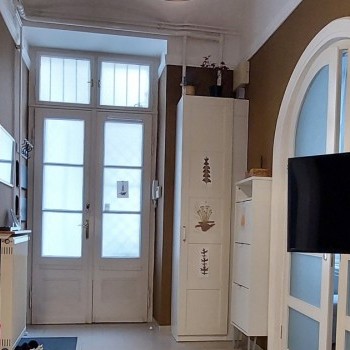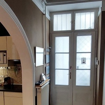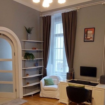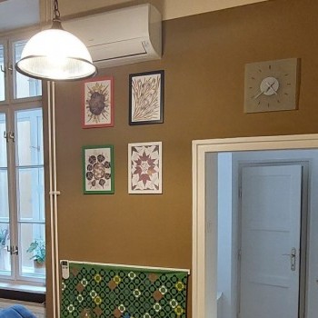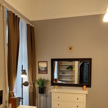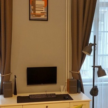 The ceiling height is about 4 metres and the rooms are bright. The apartment is furnished and equipped with air conditioning in the living room, washing machine in the bathroom and dishwasher in the kitchen. Hot water and heating is provided by a gas boiler. The apartment was redecorated in July 2024.