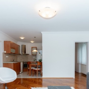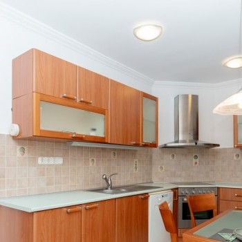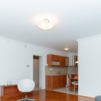 Spacious, sunny living room with American kitchen, 1 bedroom, large bathroom with window, separate toilet with hand wash, hallway with large wardrobe.