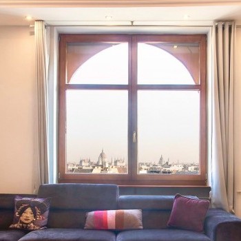 Newly renovated Luxurious 2 bedroom, fifth floor apartment with super panoramic views of the city, bright, large windows, premium furnishings for rent in the 2nd district, right next to Mechwart Liget, excellent transport links, quiet environment.