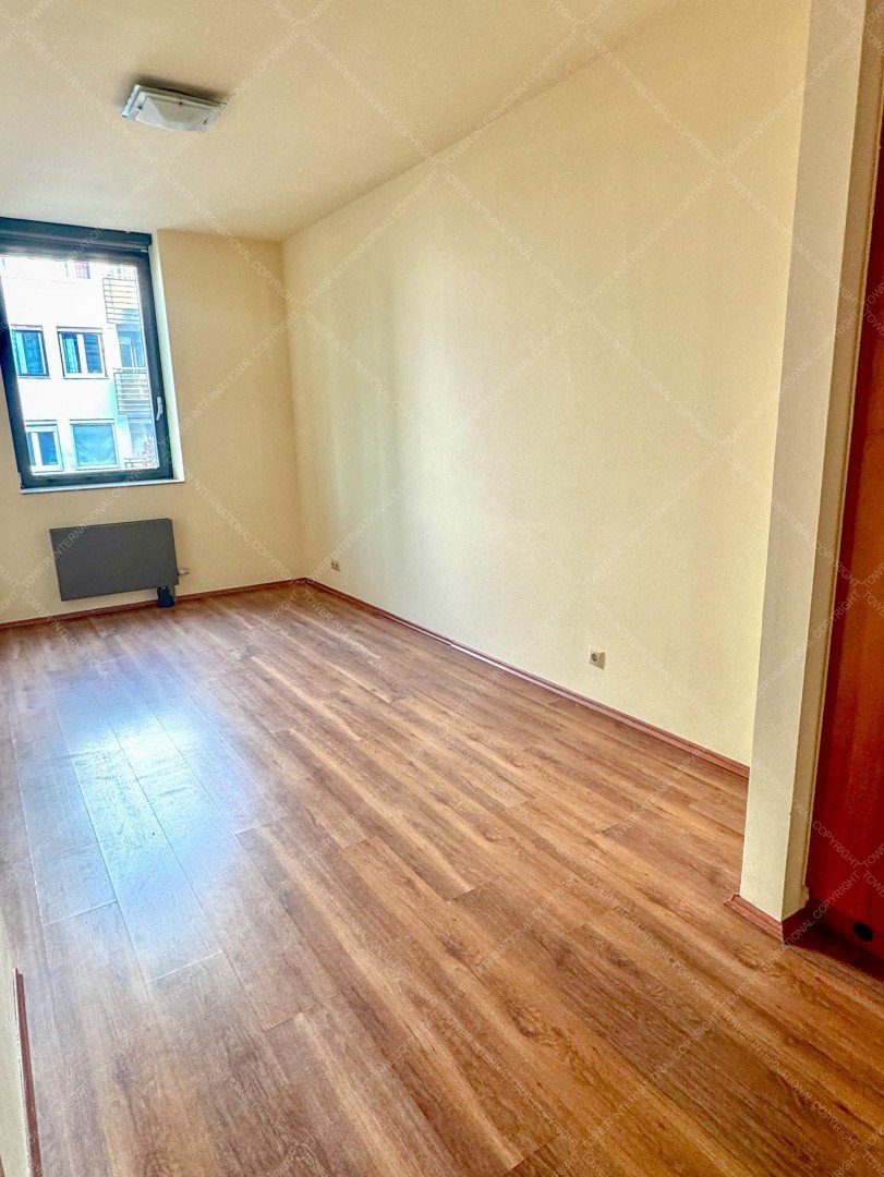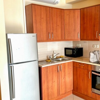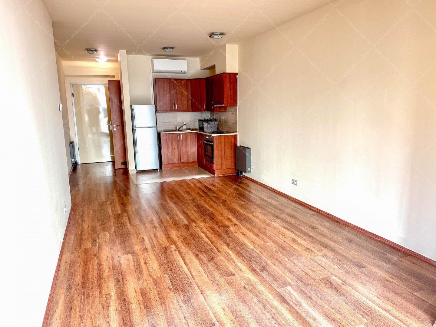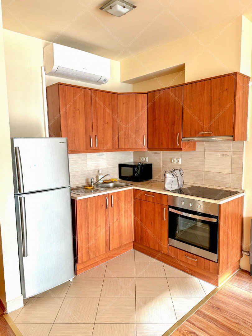 The apartment features a bright open-plan living room with kitchen, a separate bedroom, a bathroom, and a separate toilet. The bedroom includes a built-in wardrobe, offering practical storage space. The apartment is air-conditioned, ensuring comfortable living throughout the year.