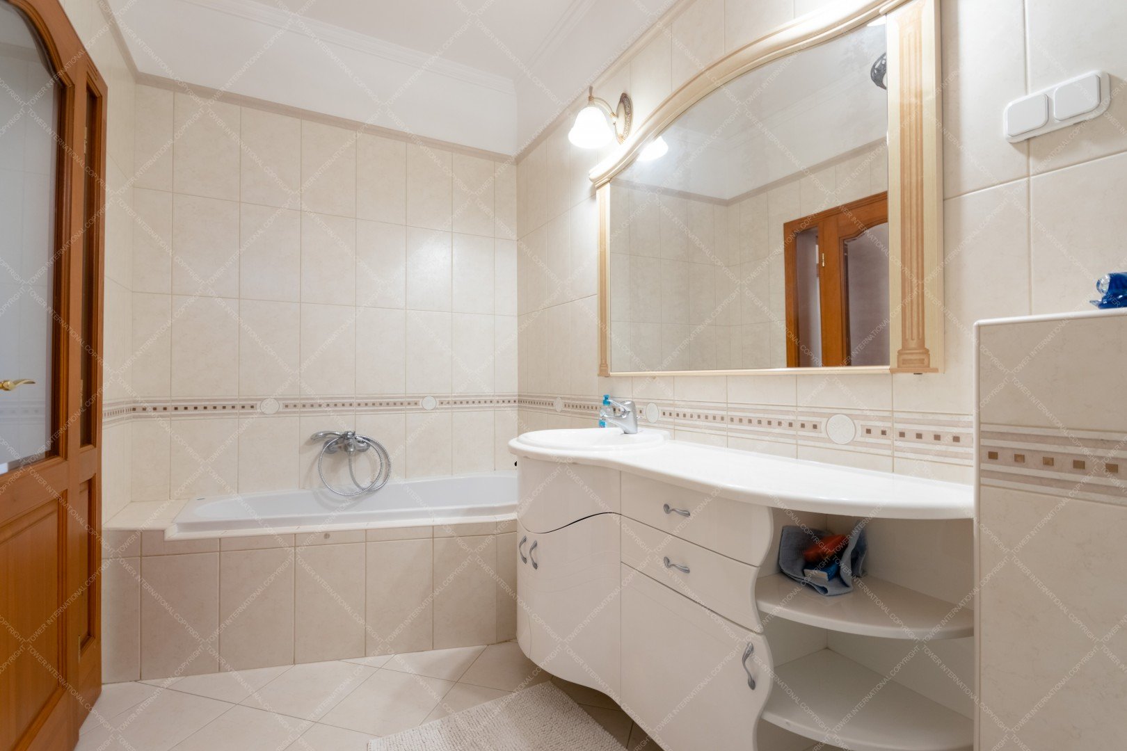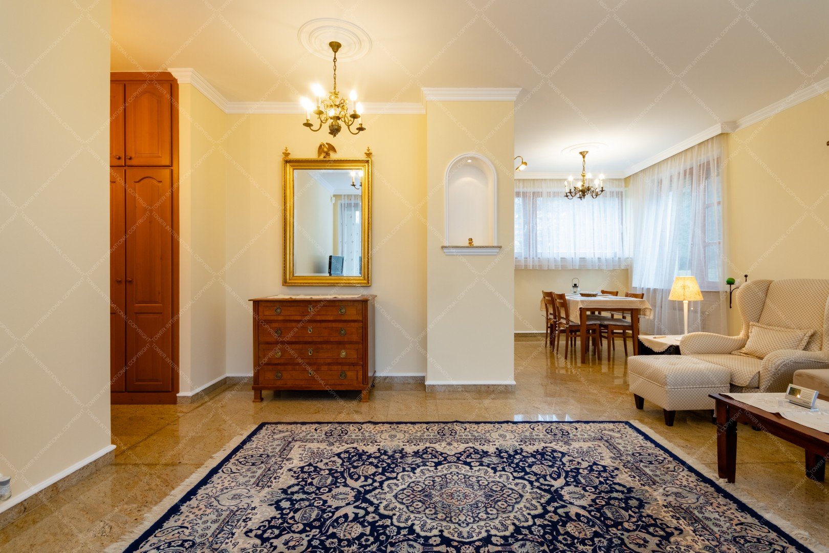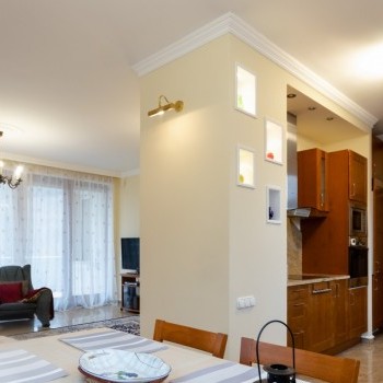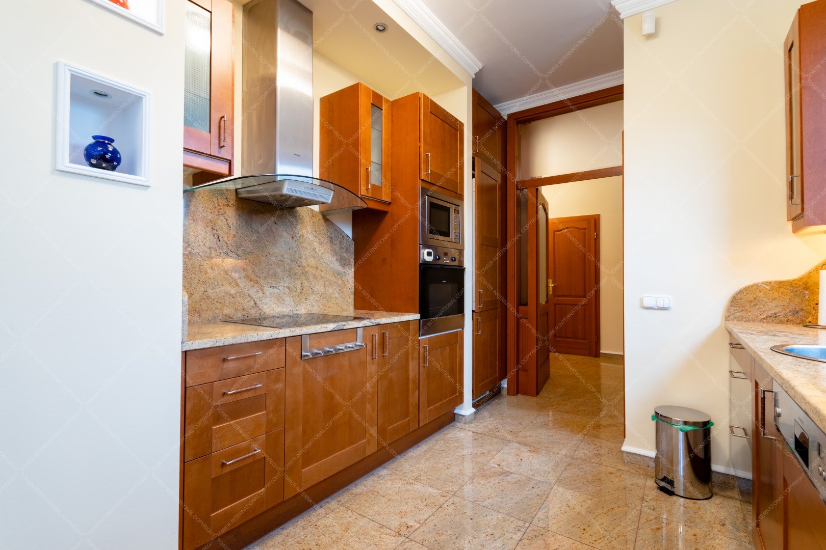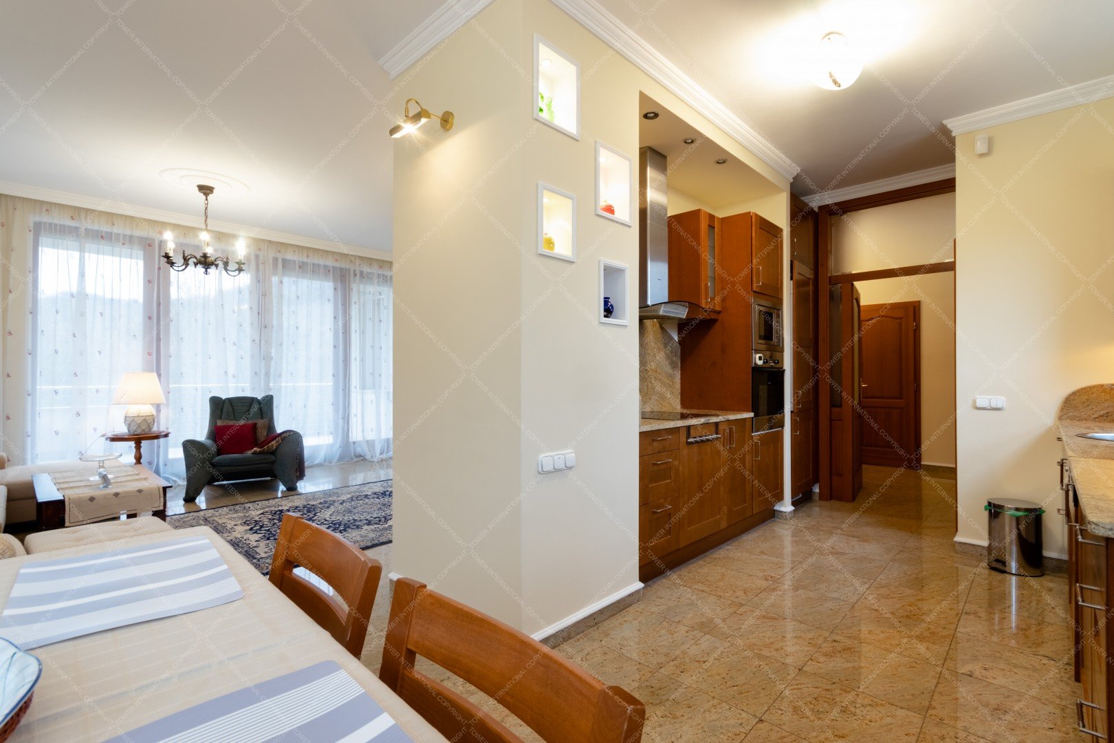 The apartment consists of 2 bedrooms, a living room, a bathroom (with bathtub, toilet and shower), a restroom and a fitted American-style kitchen with dining room, a pantry, 2 terraces and 1 garage also belong to the property, which is air-conditioned and protected by alarm system.
