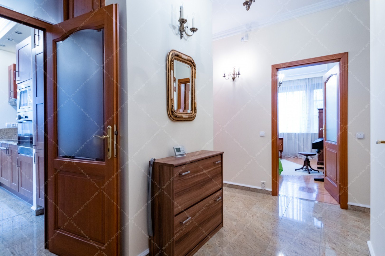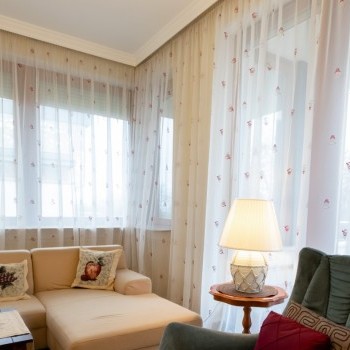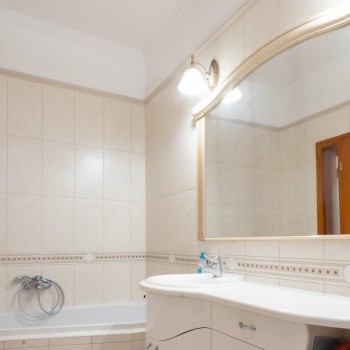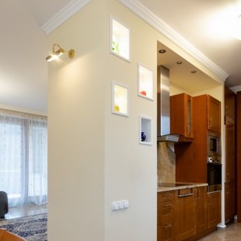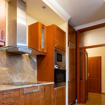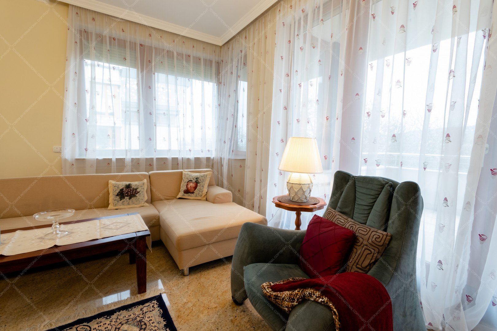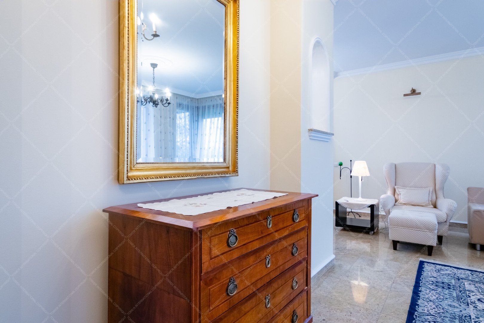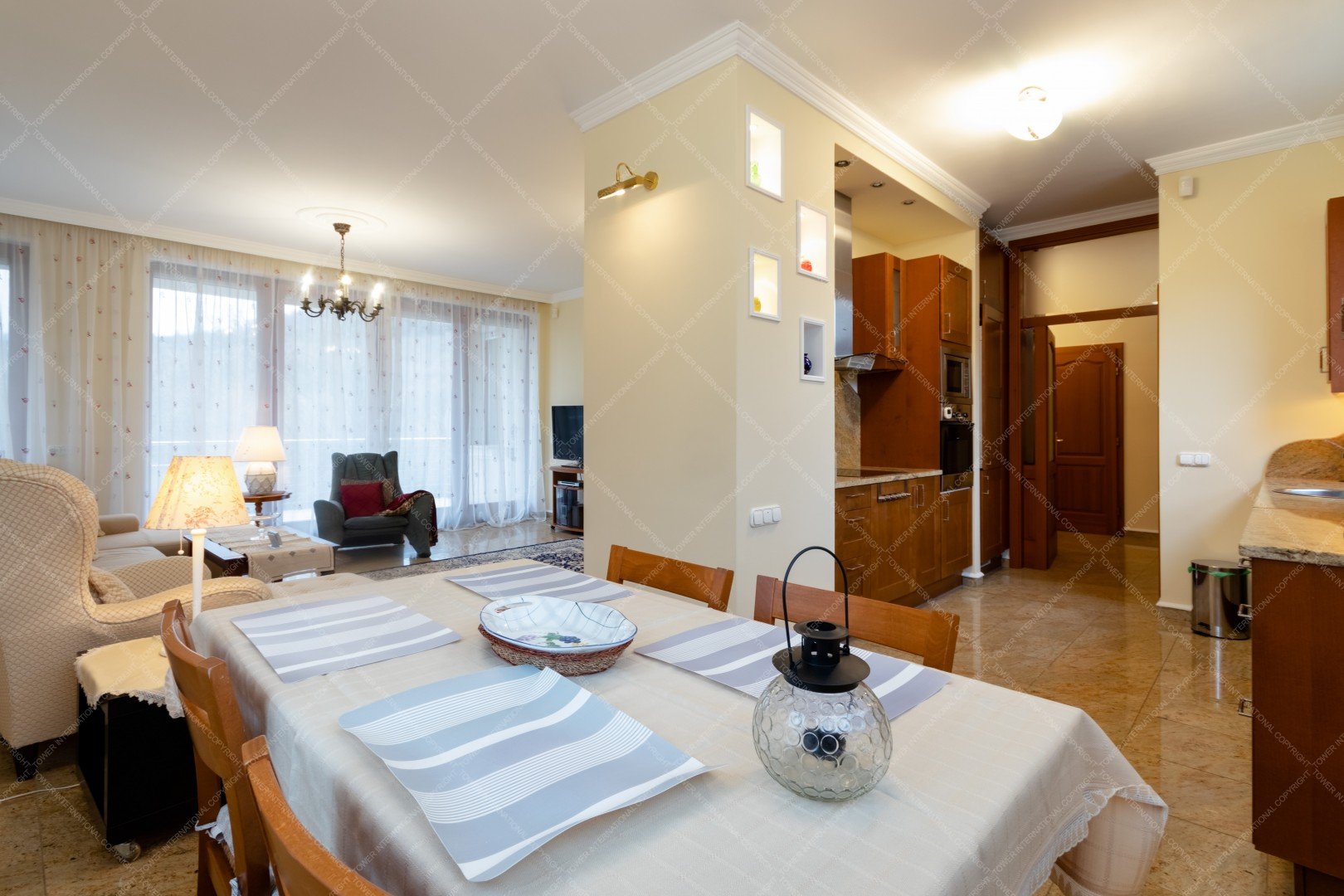The apartment consists of 2 bedrooms, a living room, a bathroom (with bathtub, toilet and shower), a restroom and a fitted American-style kitchen with dining room, a pantry, 2 terraces and 1 garage also belong to the property, which is air-conditioned and protected by alarm system.