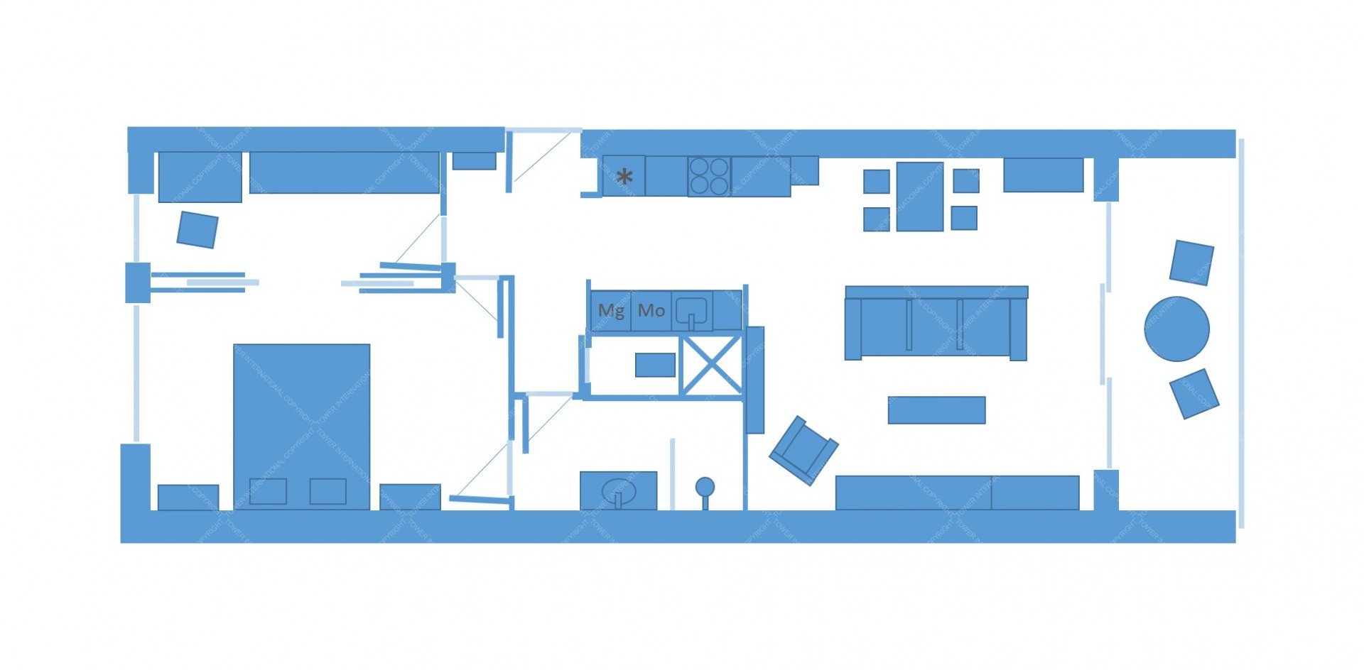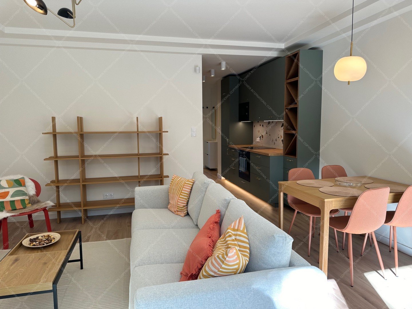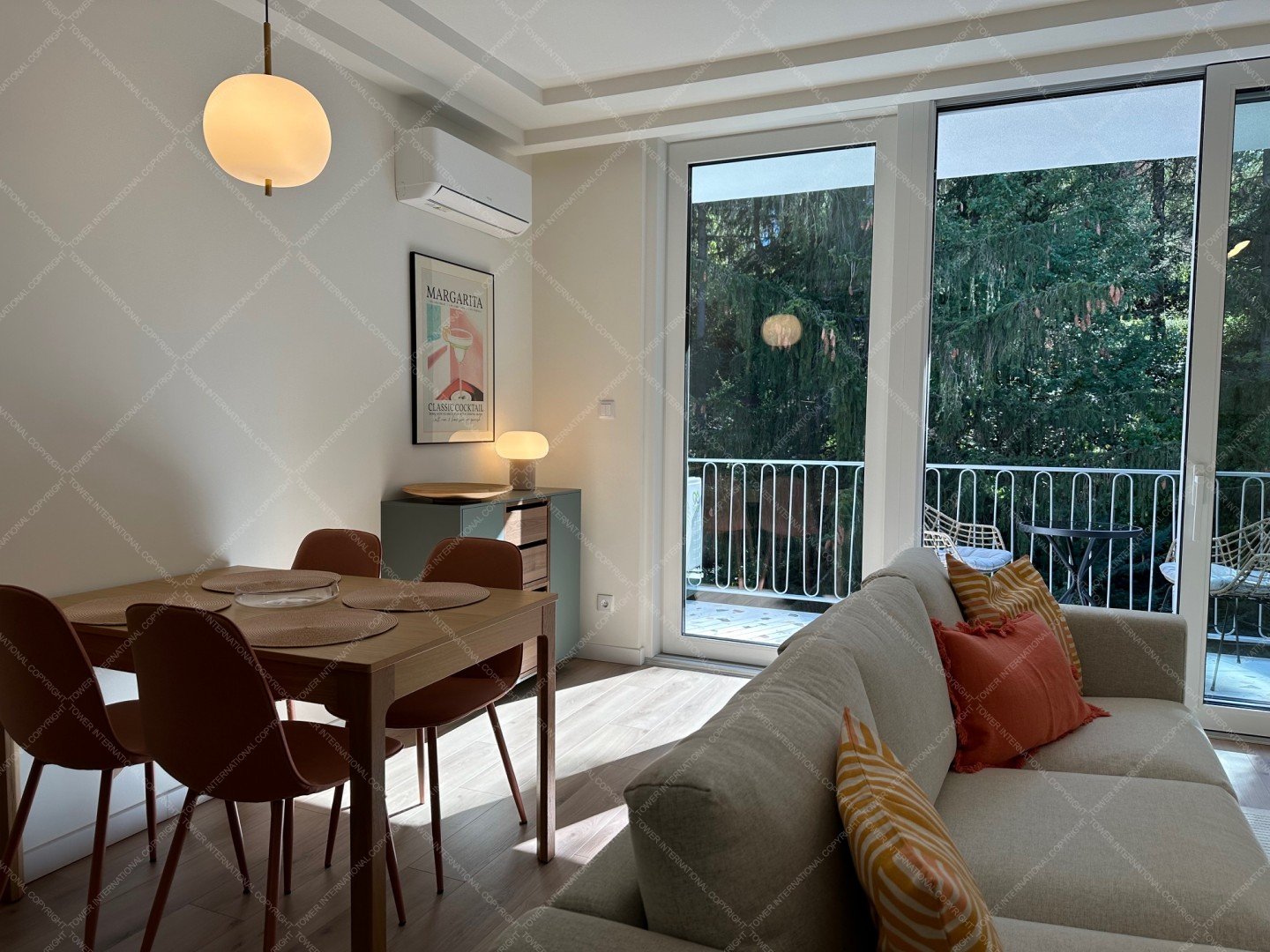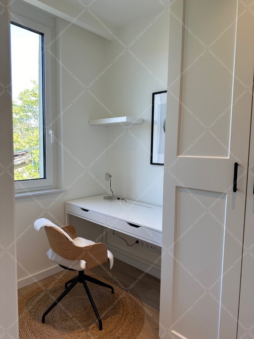 The apartment is fully furnished with brand-new furniture, including a three-seater sofa, a dining table for four, a double bed, a large built-in wardrobe, and a desk.