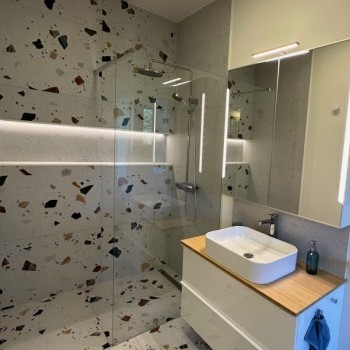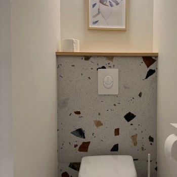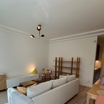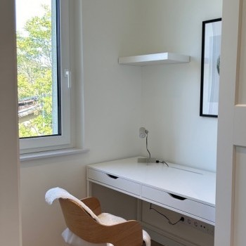 The southwest-facing living room is bright all day long and features an open-plan kitchen, creating a spacious yet well-separated living area. The terrace, accessible from the living room, faces the private garden of the building.