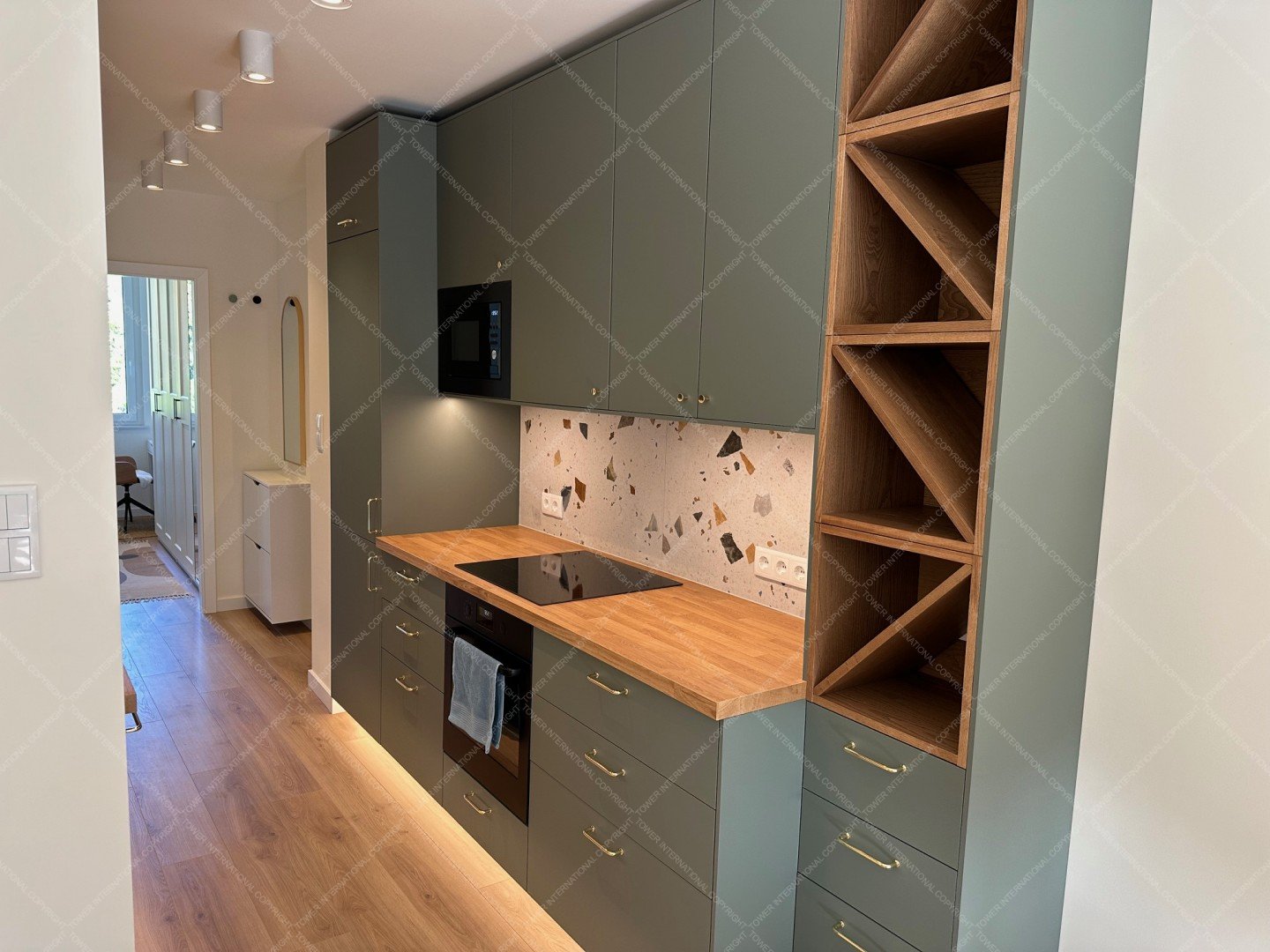 The modern kitchen is fully equipped with Electrolux built-in appliances: refrigerator, dishwasher, induction hob, oven, microwave, washer, and dryer.