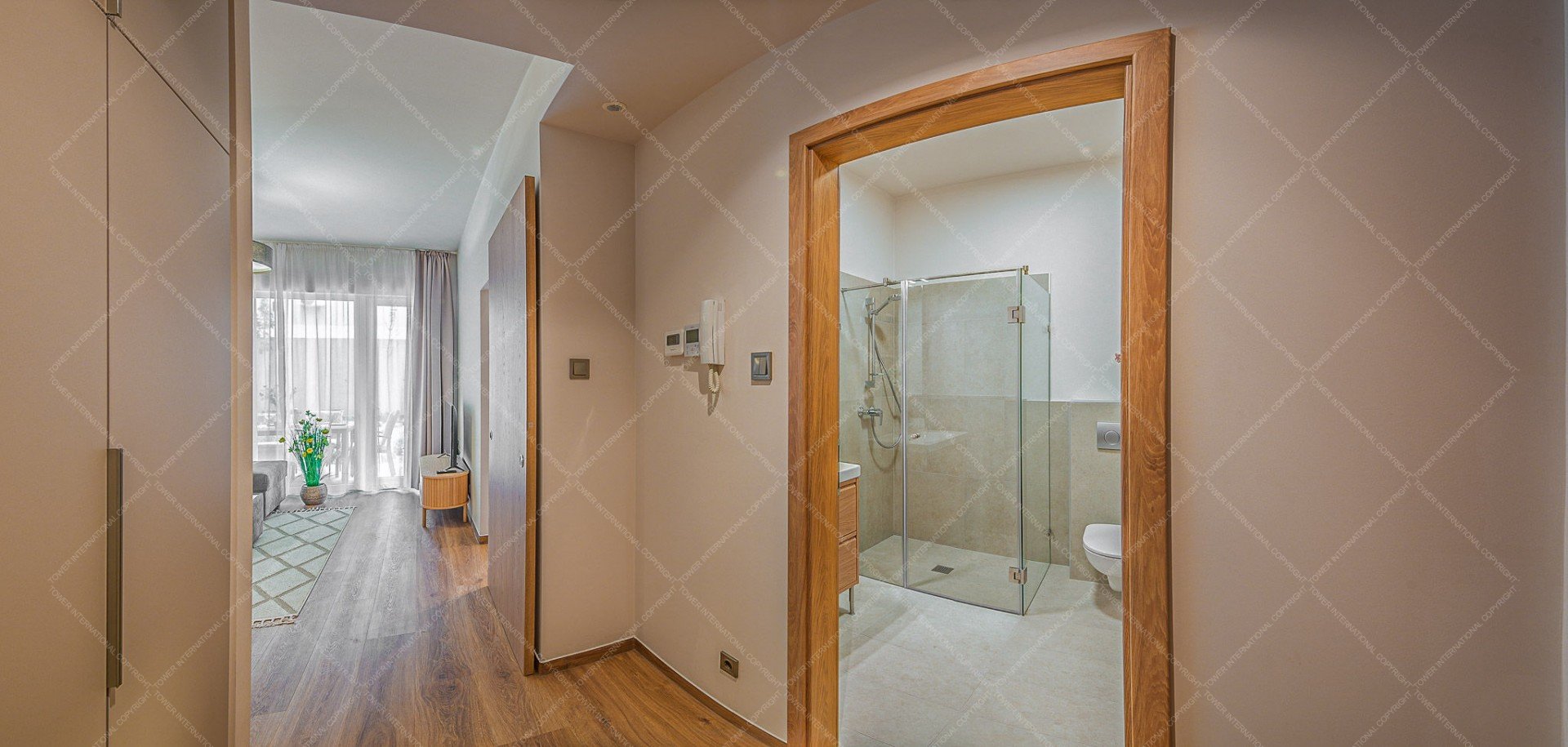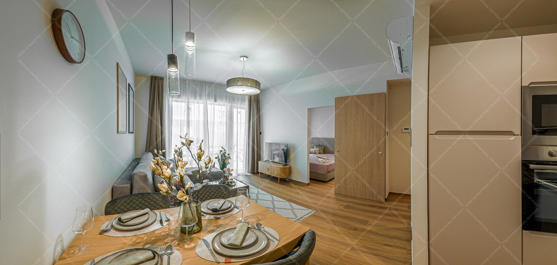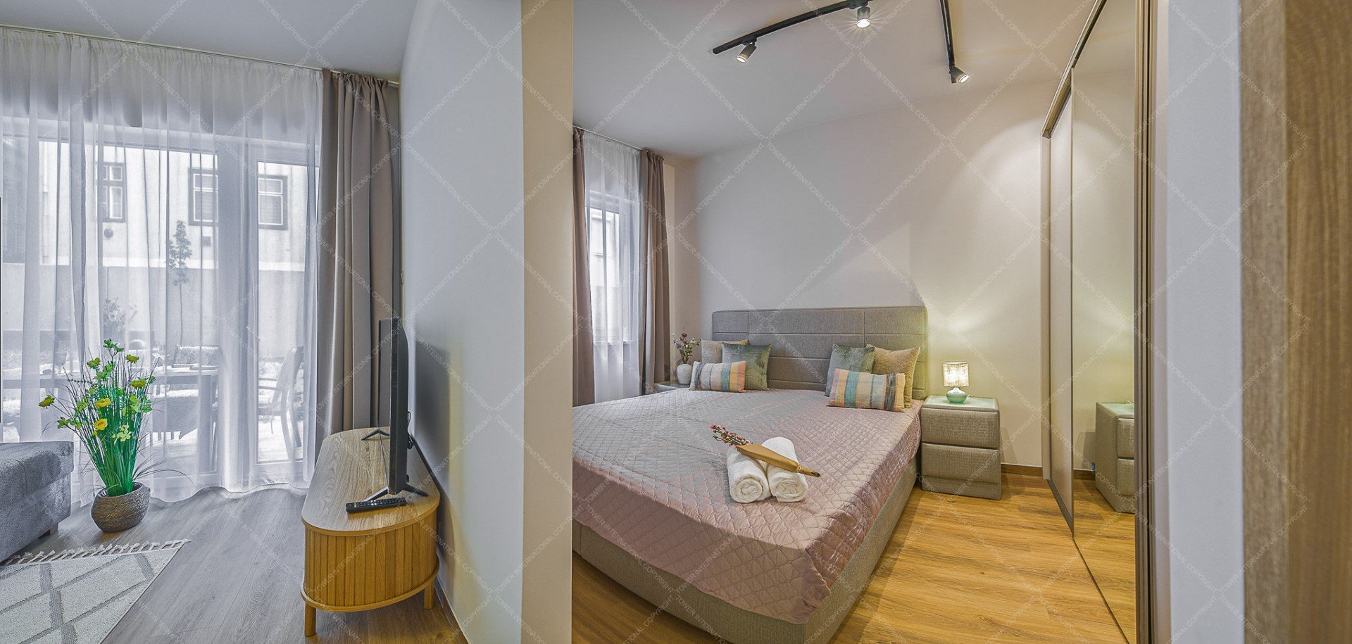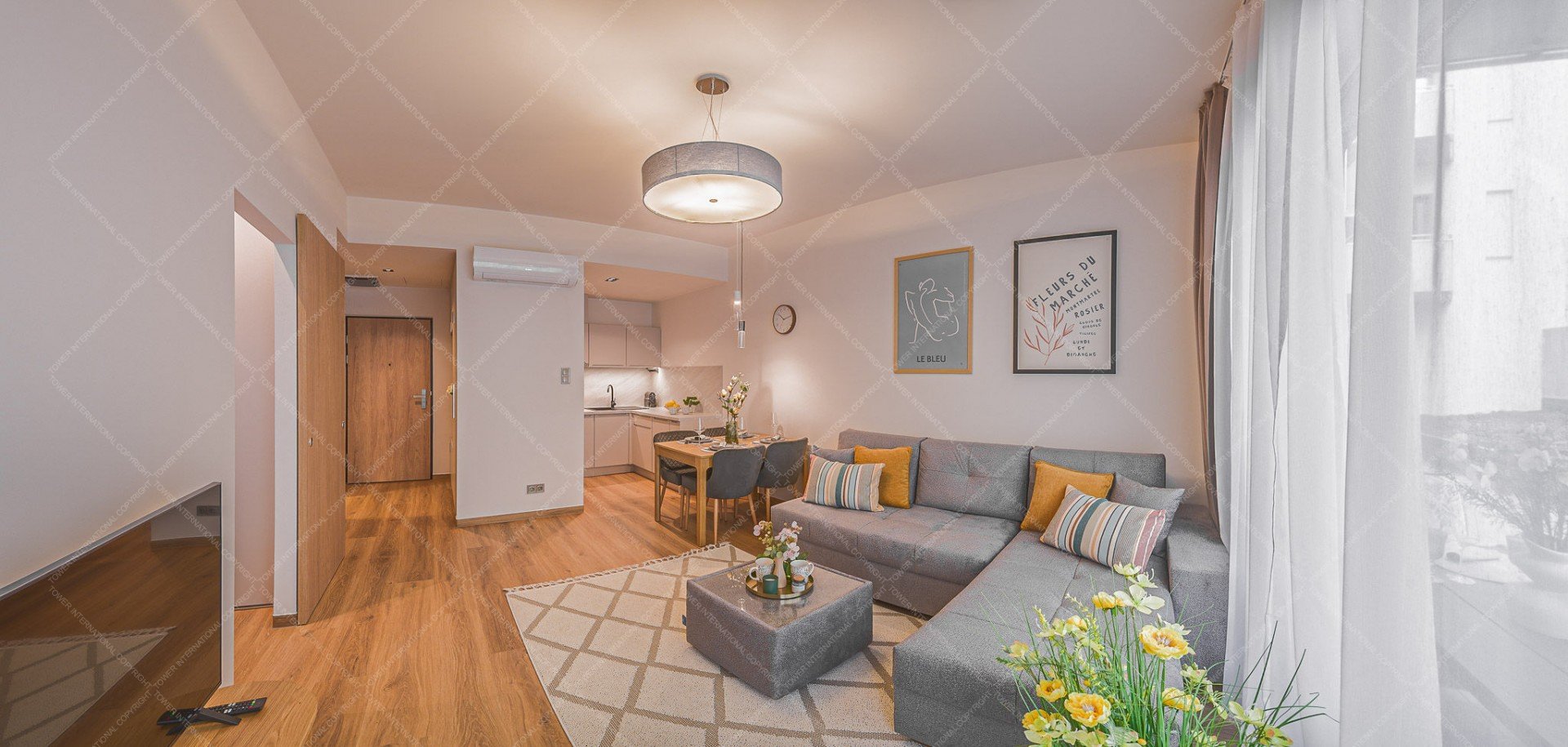 The apartment offers a bright and spacious living room and a cozy bedroom, all furnished in a clean, contemporary style. Everything is brand new and thoughtfully designed – all you need to bring is your suitcase! The apartment includes air conditioning for summer comfort and an elevator in the building for easy access.
