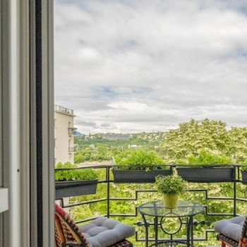 The balcony opens up to stunning views of the Danube River, Margaret Island, and lush greenery, offering a peaceful retreat in the city.