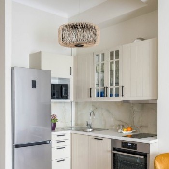 This tastefully designed apartment features a fully equipped American-style kitchen with modern appliances (oven, hob, microwave, fridge, extractor fan), and all necessary utensils for everyday living.