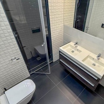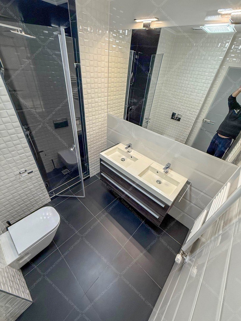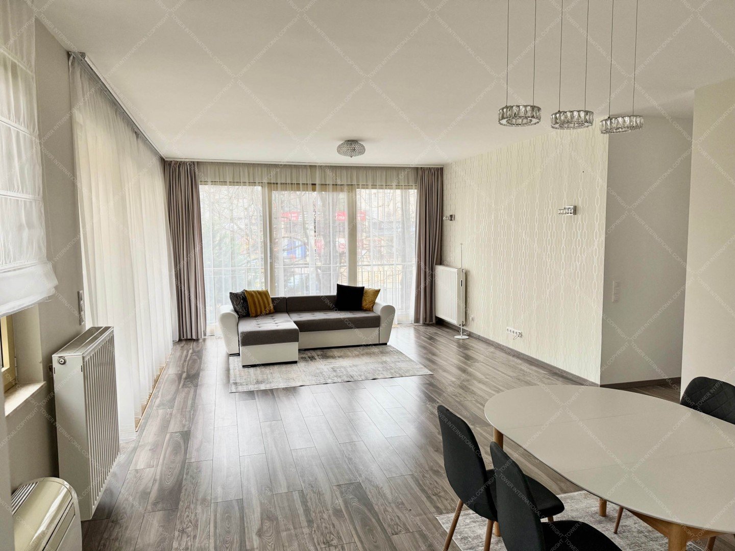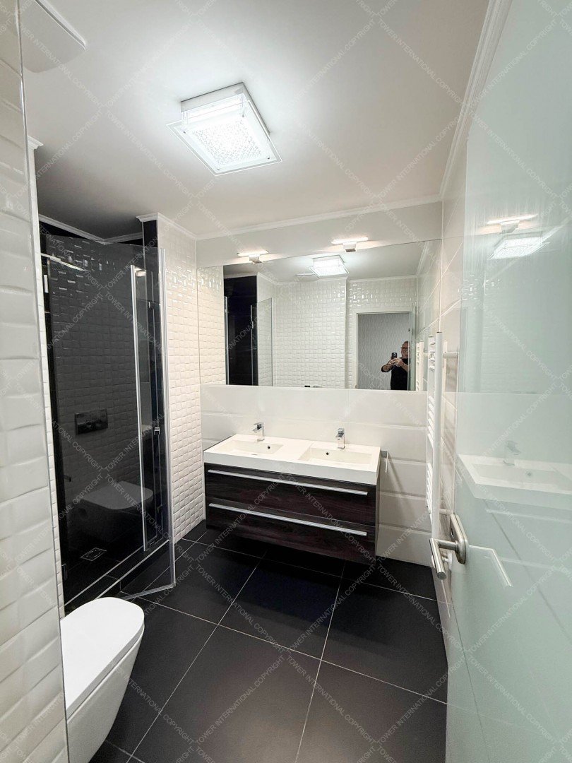 The apartment includes a fully equipped kitchen, a spacious open-plan living and dining area, 3 bedrooms, 2 bathrooms, and a separate guest toilet. Large glass surfaces, contemporary finishes, and partial furnishing ensure a comfortable living environment.