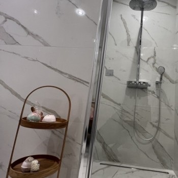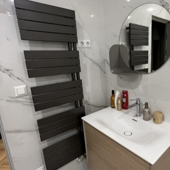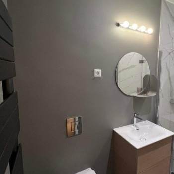 For rent: second floor, 80 square meter apartment with 2 bedrooms, 2 bathrooms, open-plan kitchen, and bright living room.