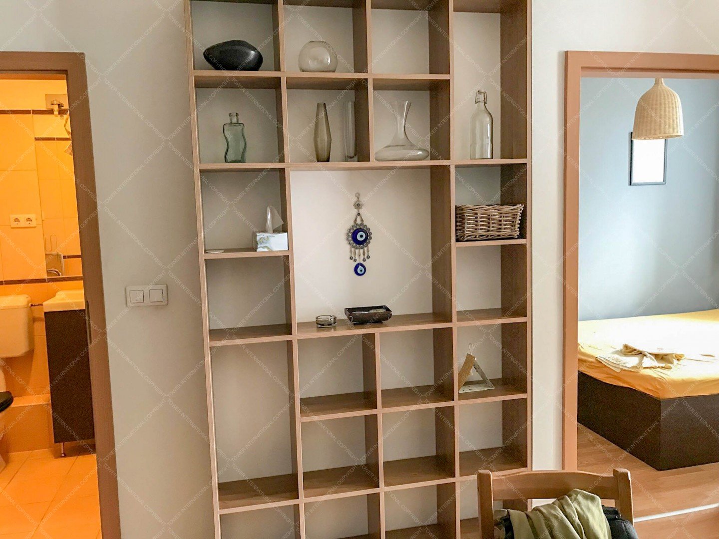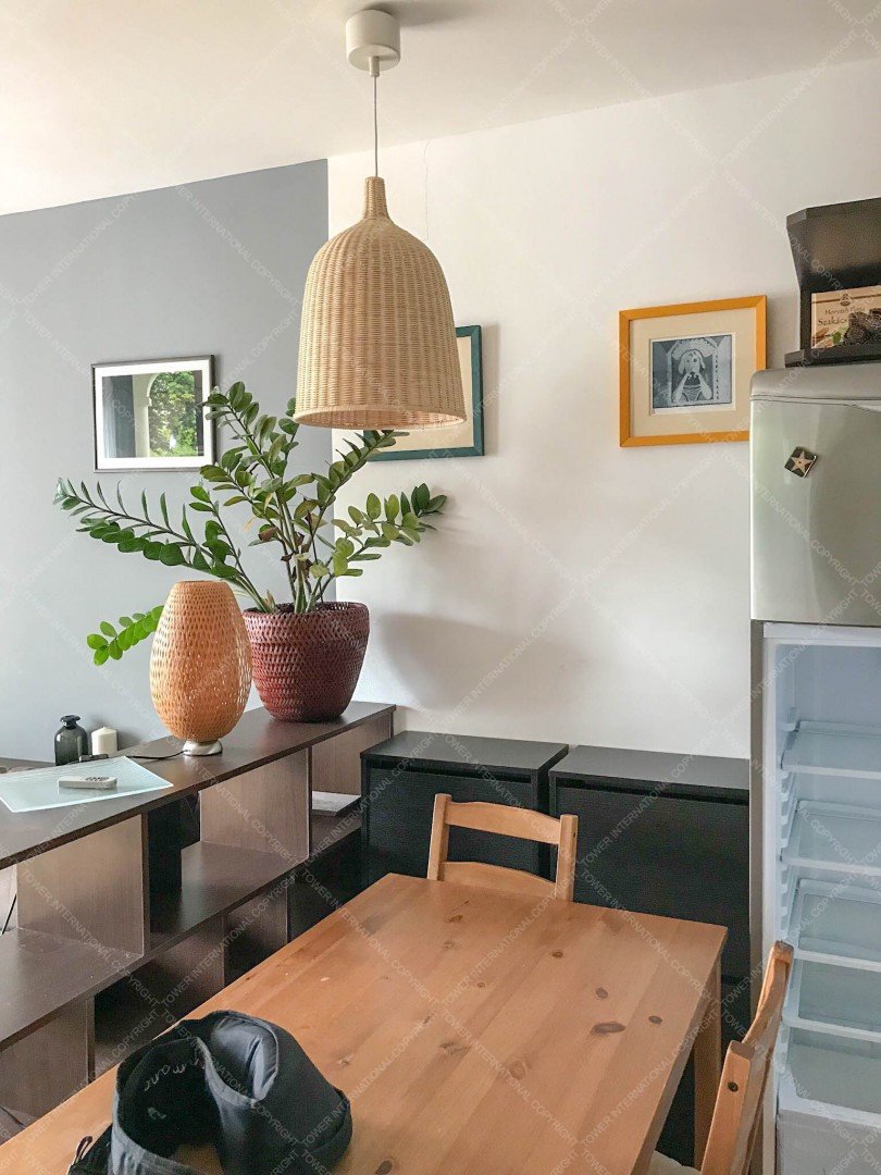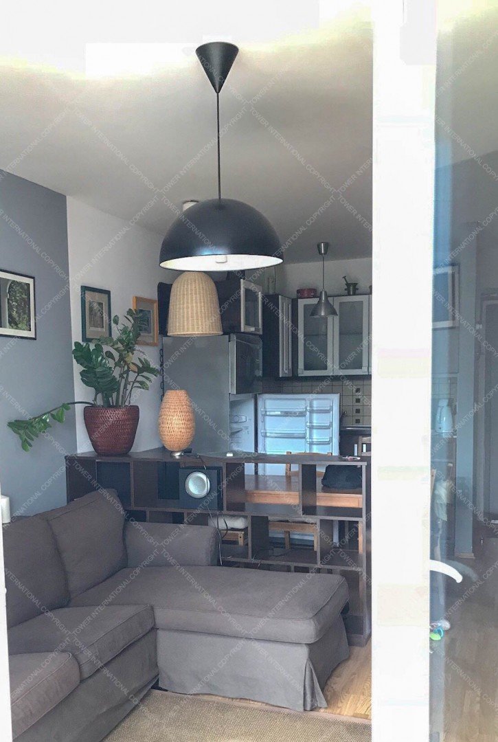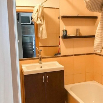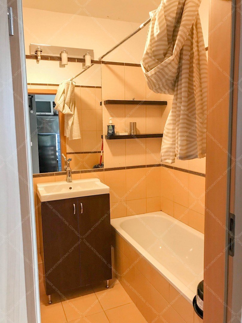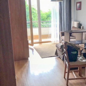 The apartment is fully furnished. The kitchen is equipped with essential appliances (hob, oven, microwave, mixer, coffee machine). A washing machine, iron, air conditioning, and TV are also included.
