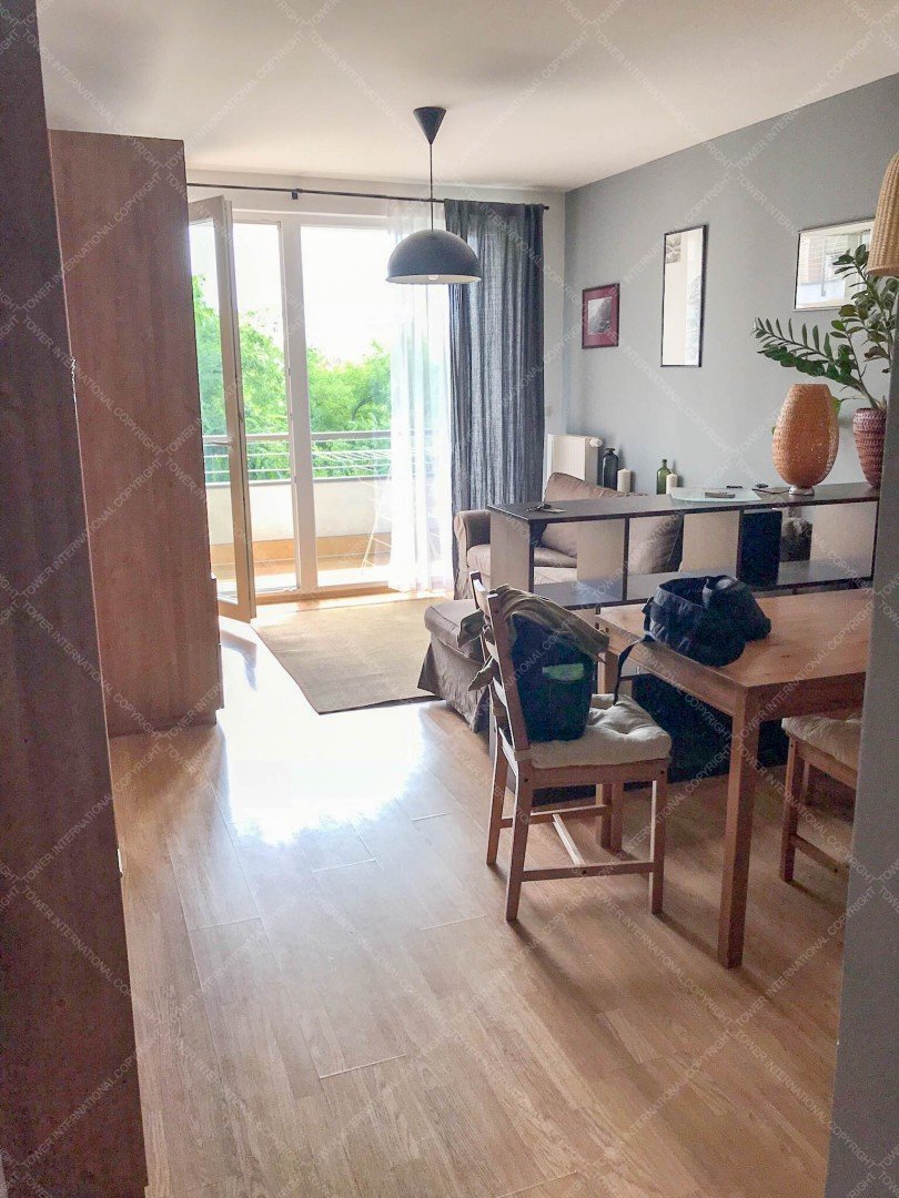 The balcony overlooks a quiet garden with green trees for most of the year, and the entrance to the large park of the National University of Public Service (NKE) is located directly across the street.