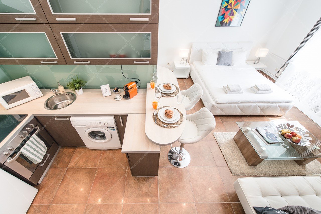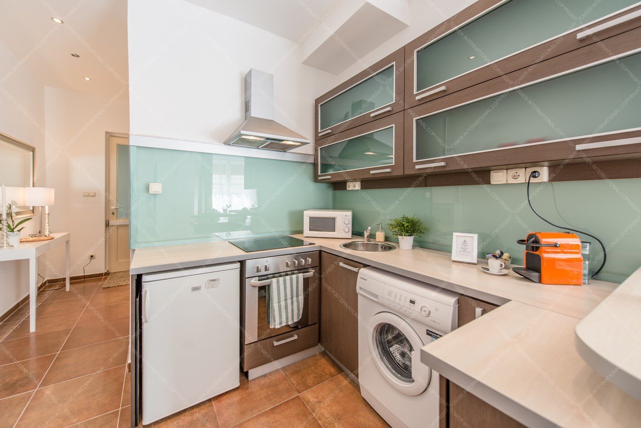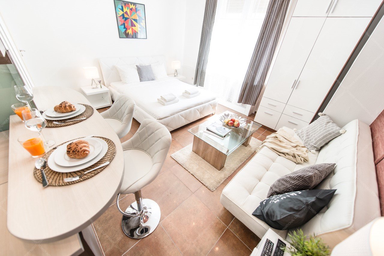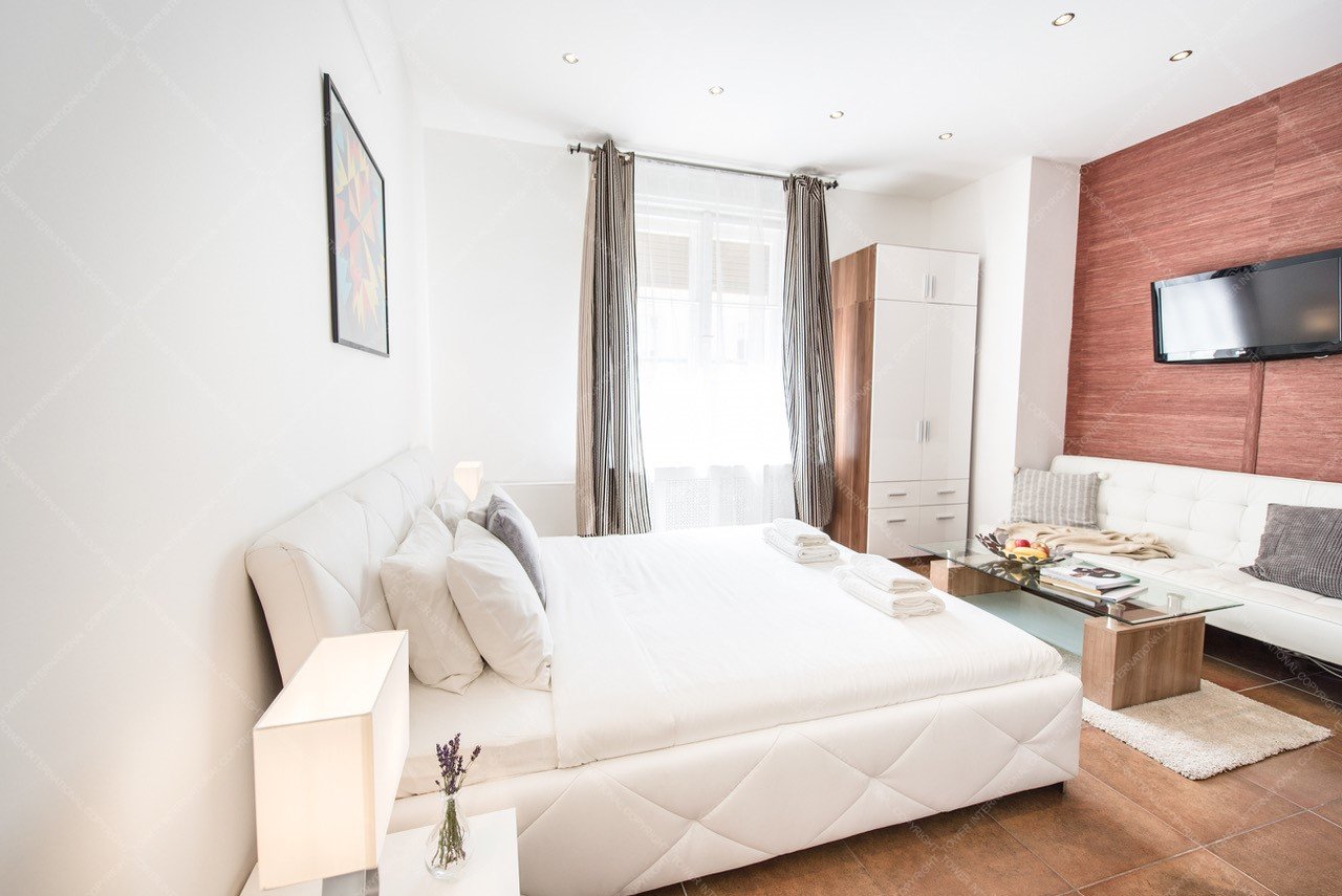 We offer 31 sqm furnished studio apartment in district 5th in Veres Pálné stree. It is situated in a classical building on the 2nd floor. The windows are facing to the street. It consists of a living room-bedroom with american kitchen, toilet and bathroom. The common cost is 18900 huf includes heating and water usage. Pets are allowed!