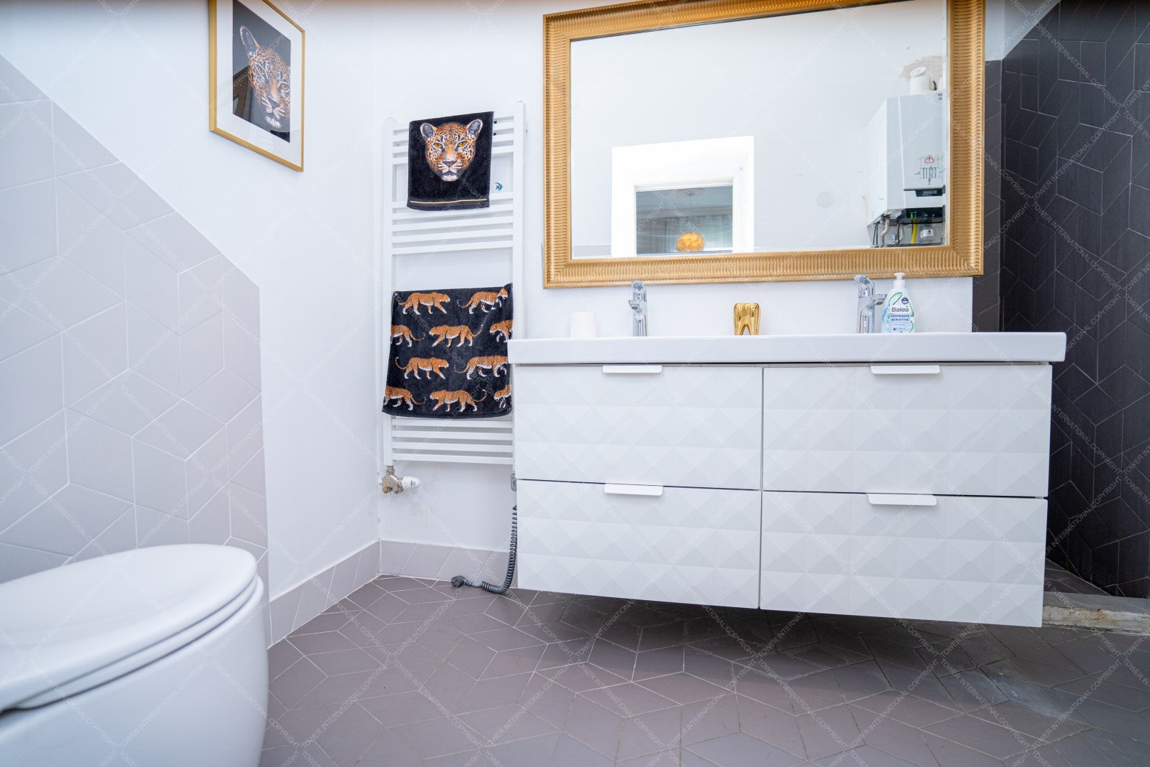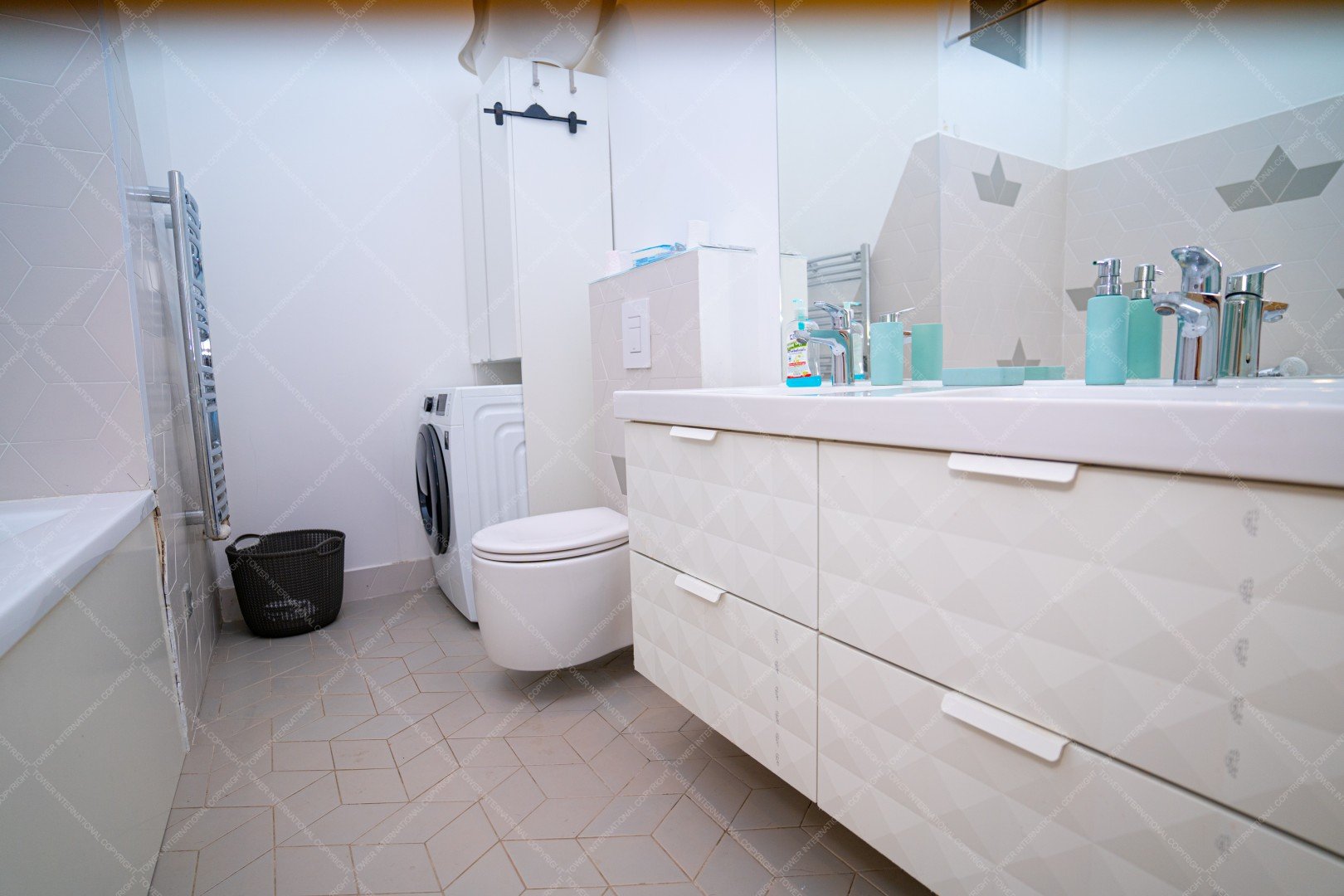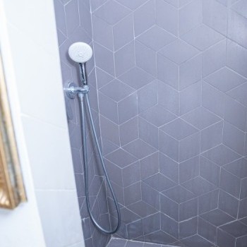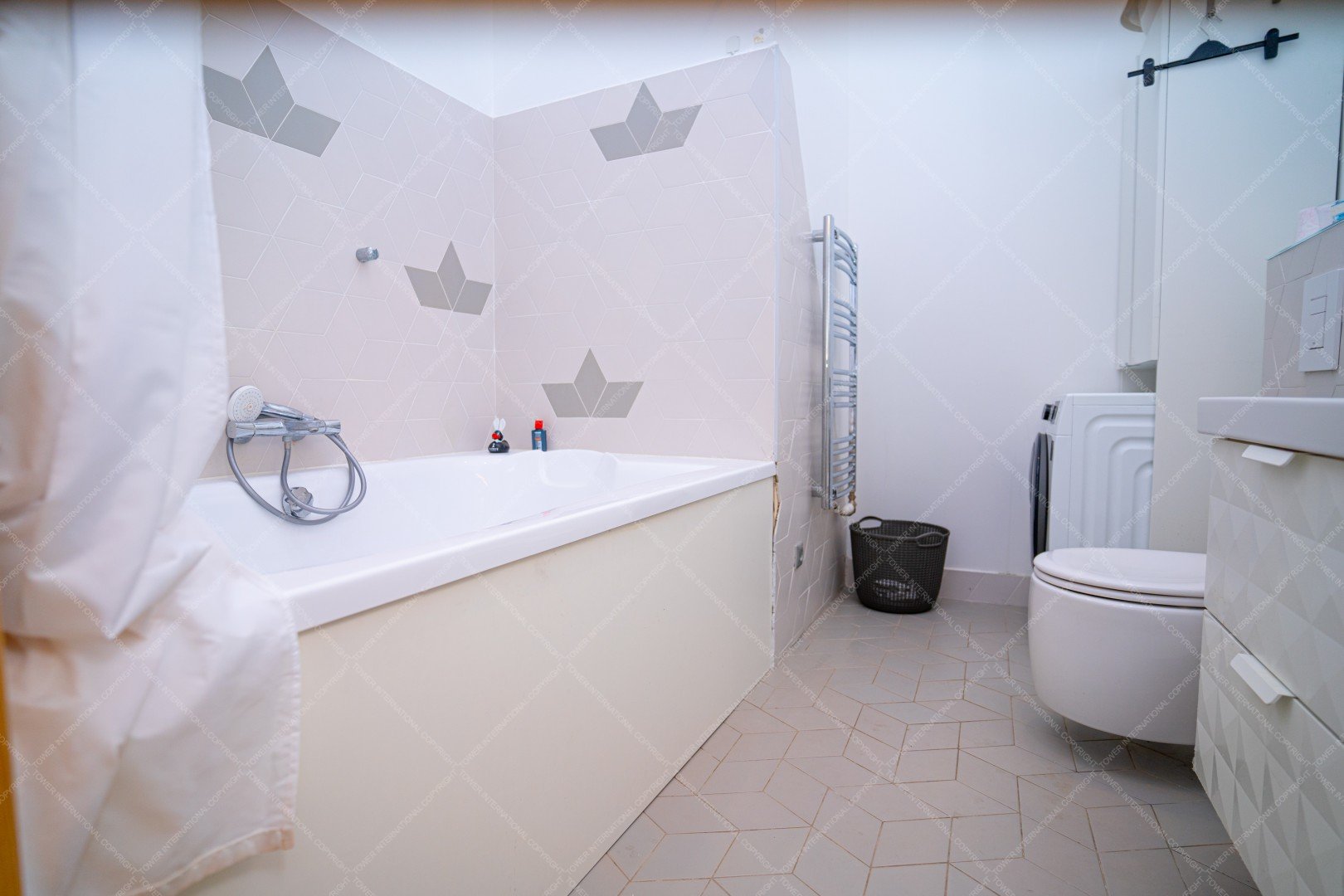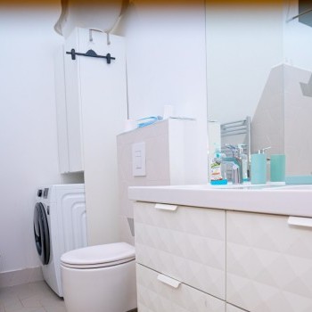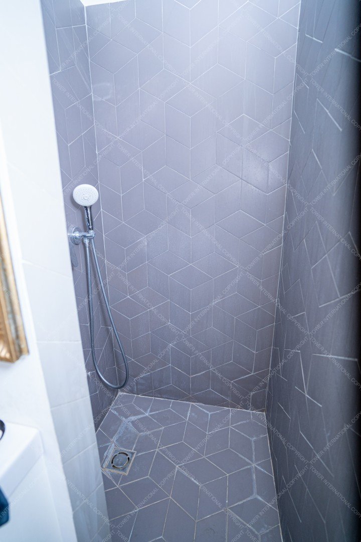 It consists of 3 bedrooms, 2 bathrooms one with bubble bathtub and the other with shower, 2 restrooms, a kitchen, a shower and a living room.