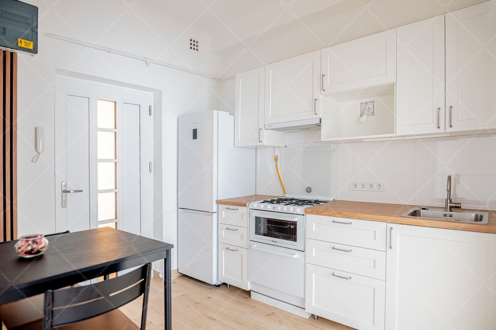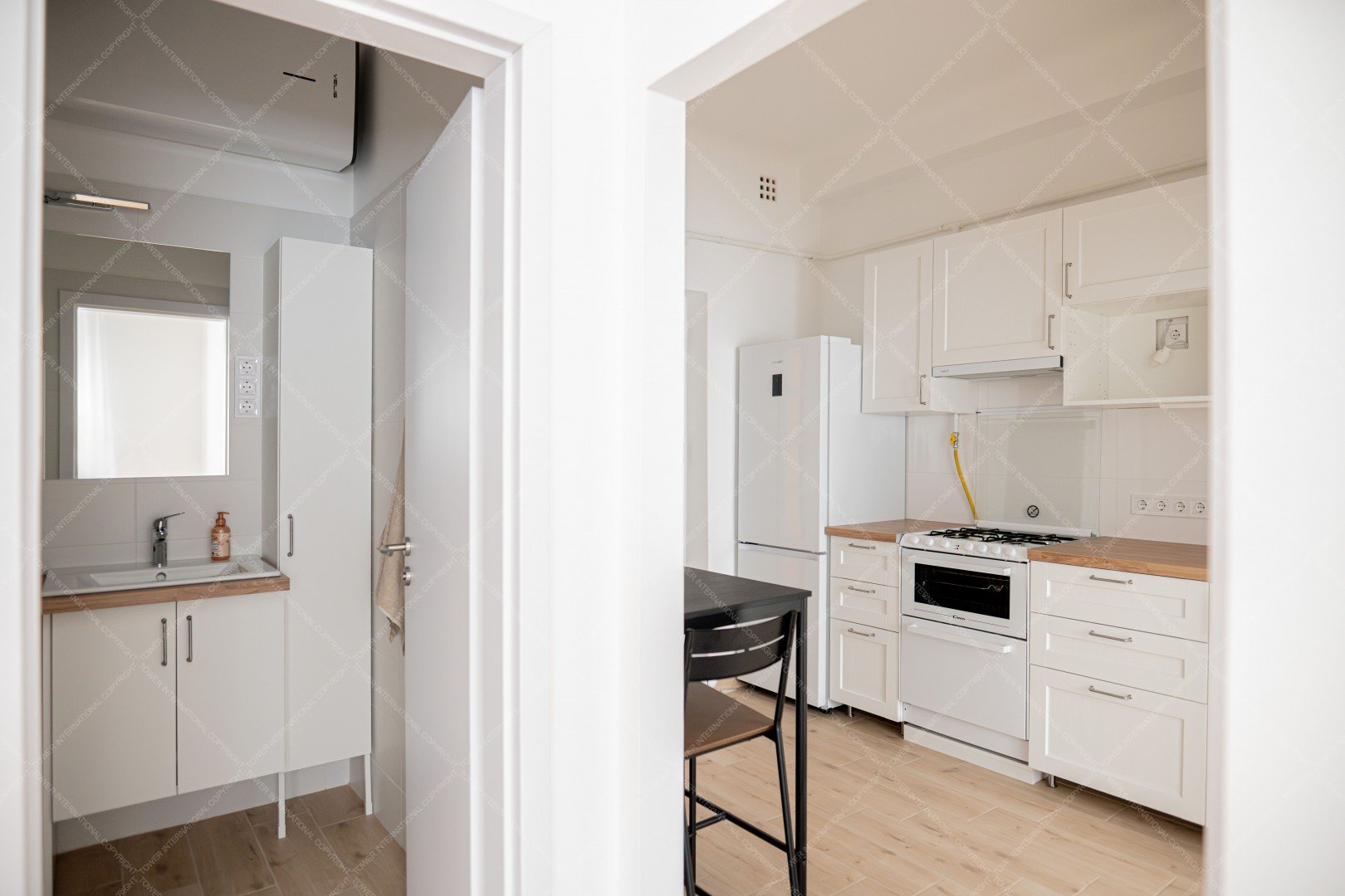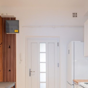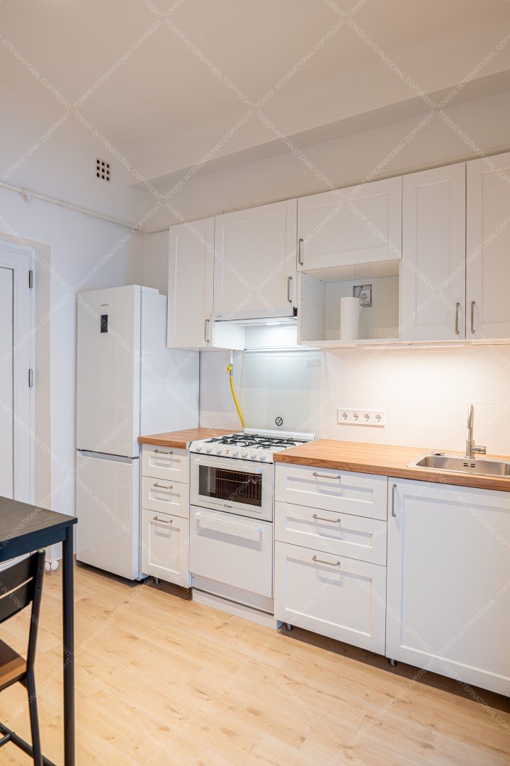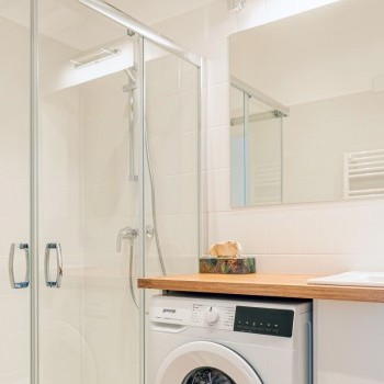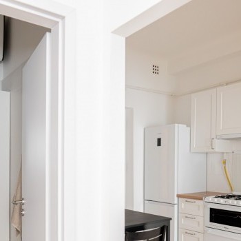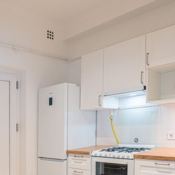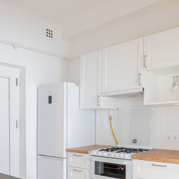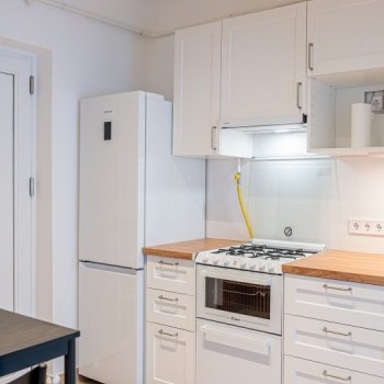 Entering the apartment, we arrive in a spacious kitchen, where there is a hallway wall and a dining table for two with chairs. The kitchen has a Samsung smart refrigerator and a Candy Trio 3-in-1 appliance, which is a gas stove on top, an electric oven in the middle, and a 6-person dishwasher at the bottom. This means that the kitchen has all the appliances you need, yet still plenty of space.