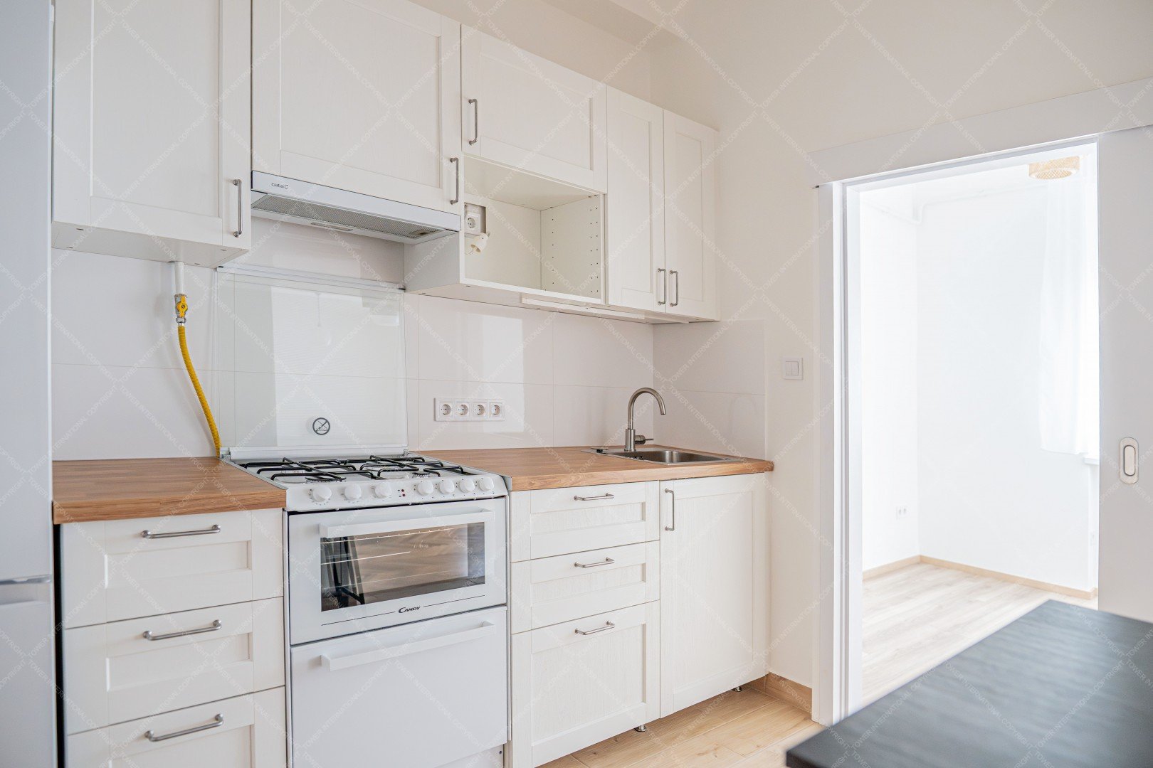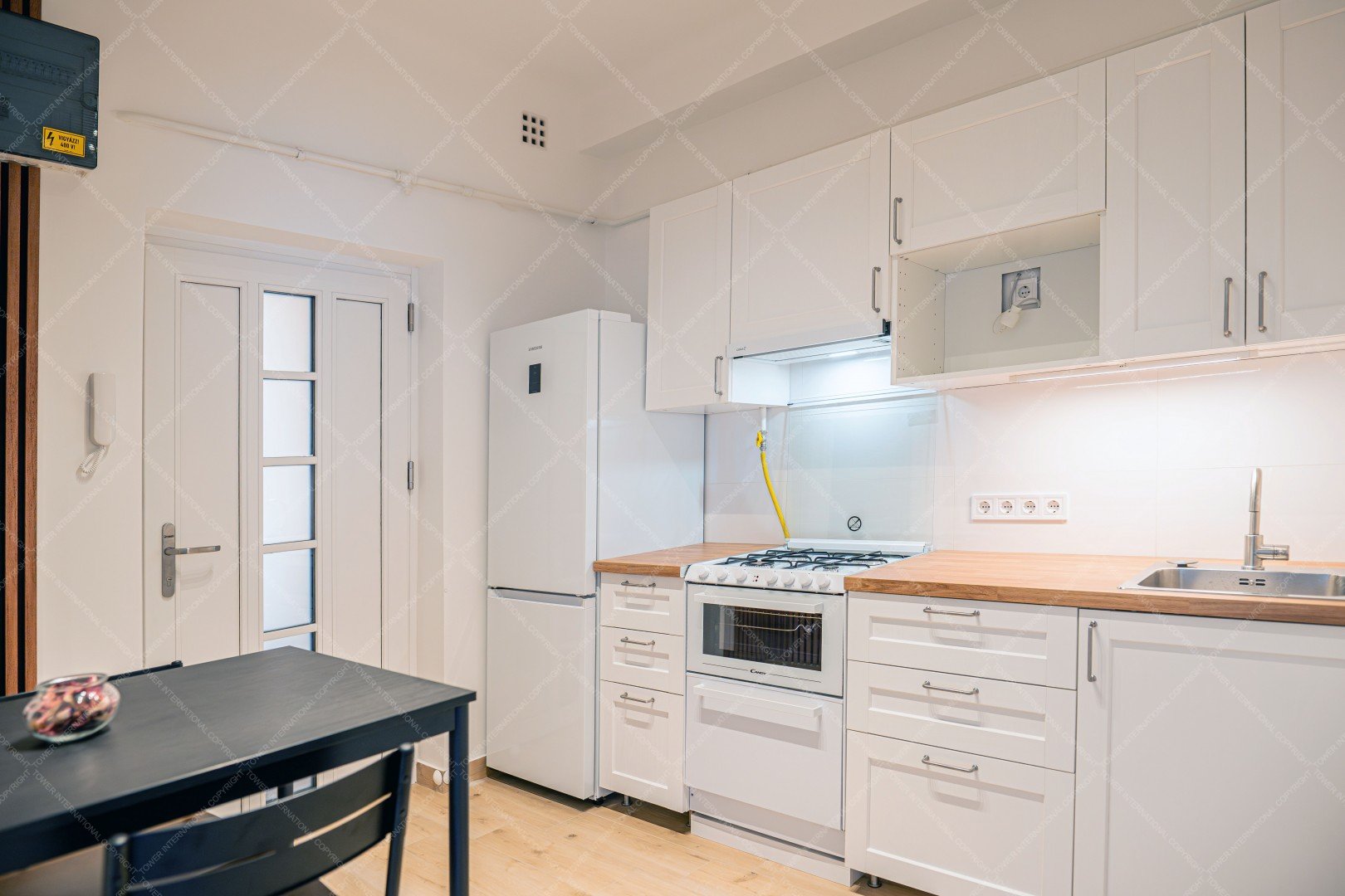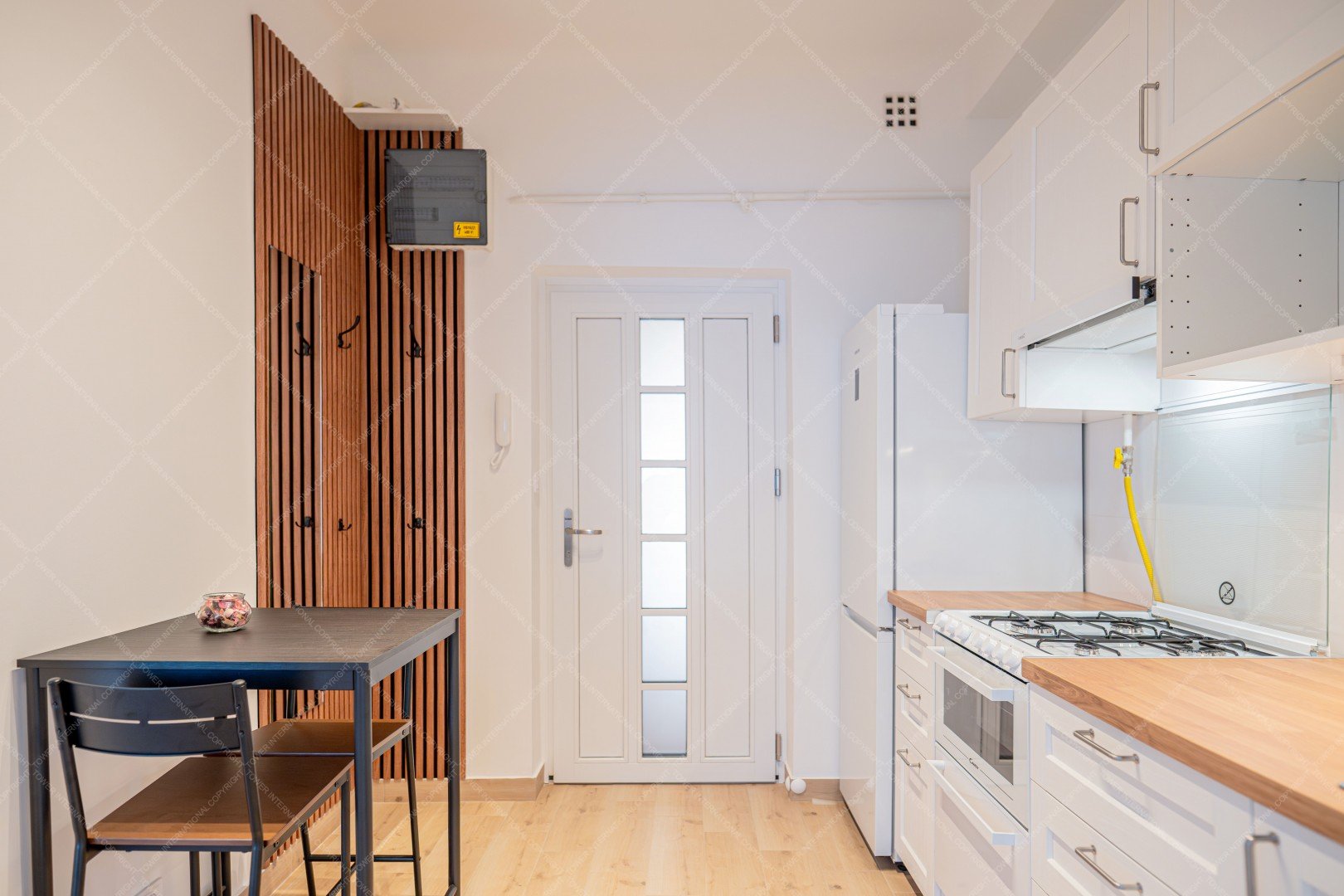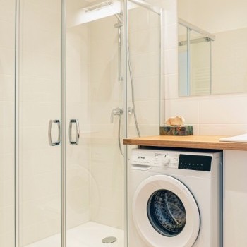 Entering the apartment, we arrive in a spacious kitchen, where there is a hallway wall and a dining table for two with chairs. The kitchen has a Samsung smart refrigerator and a Candy Trio 3-in-1 appliance, which is a gas stove on top, an electric oven in the middle, and a 6-person dishwasher at the bottom. This means that the kitchen has all the appliances you need, yet still plenty of space.