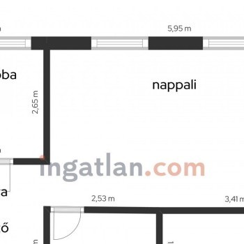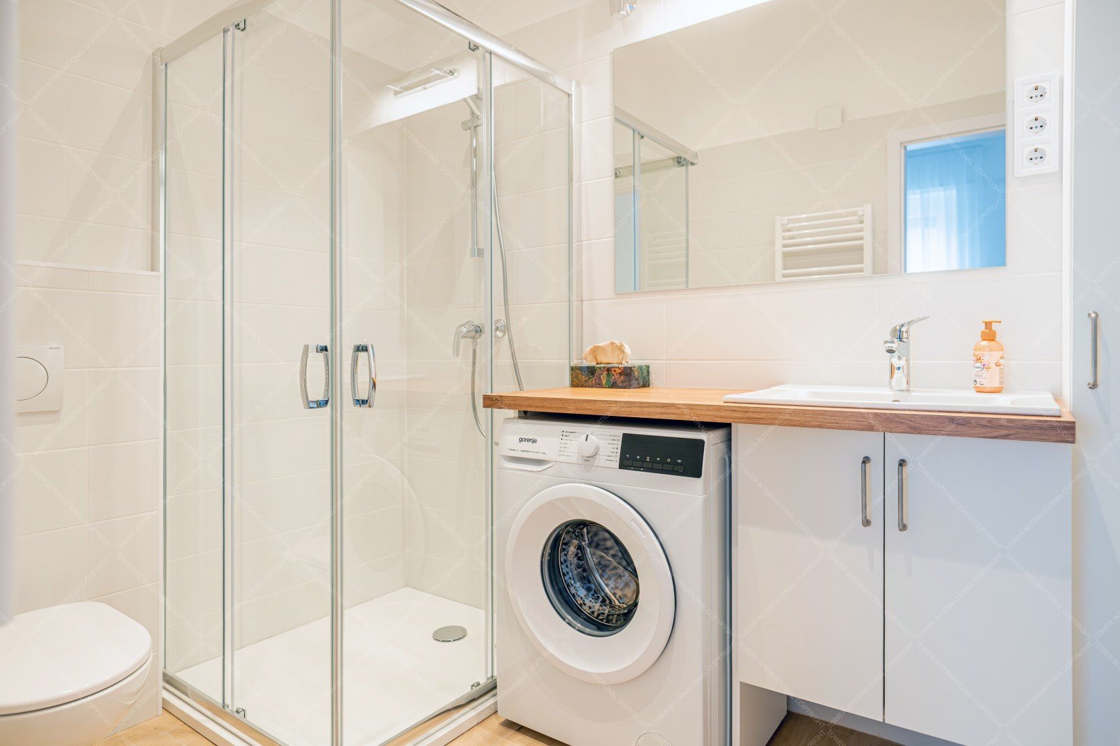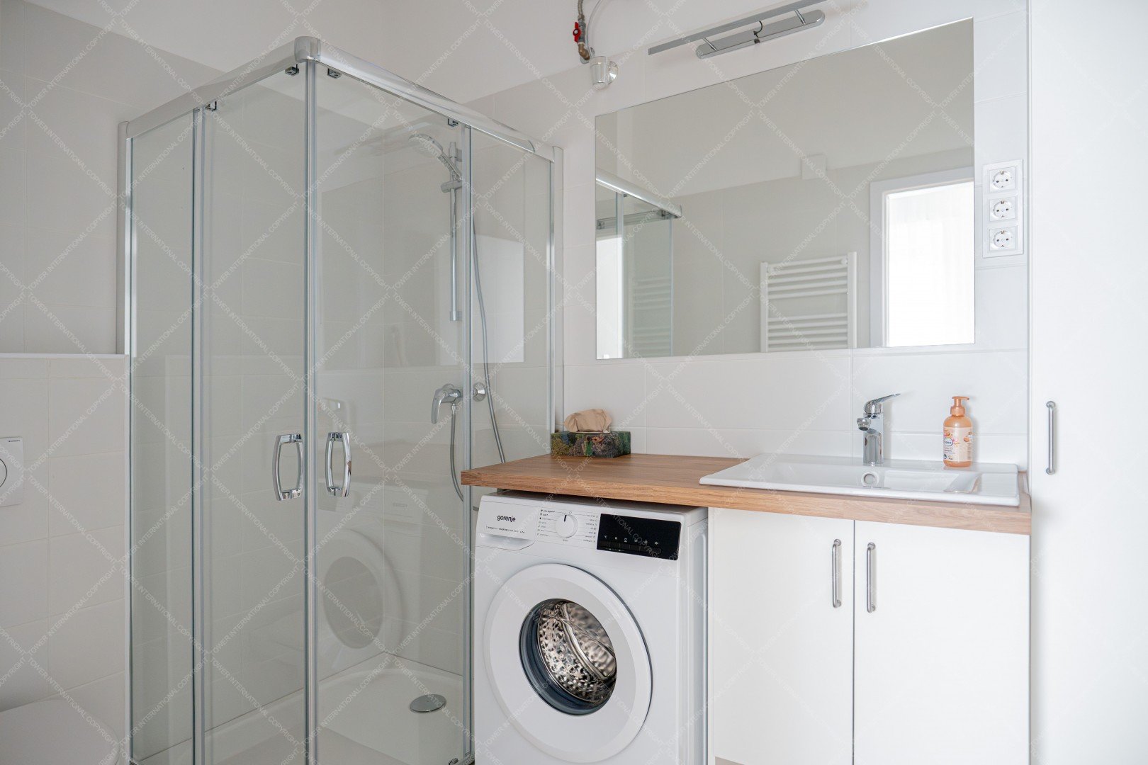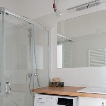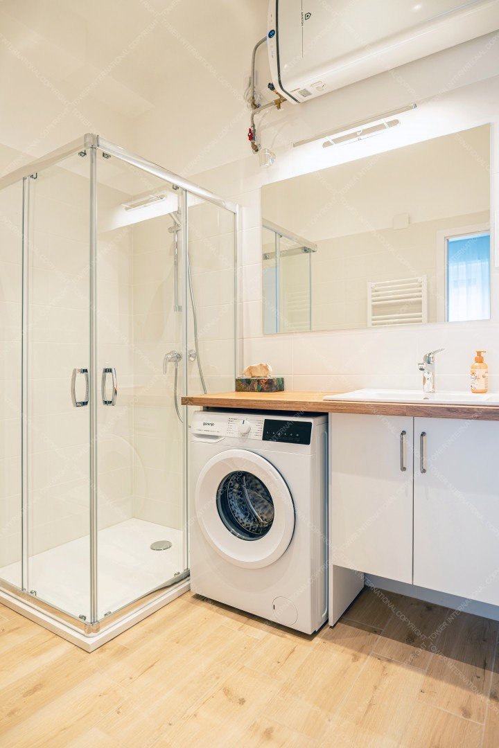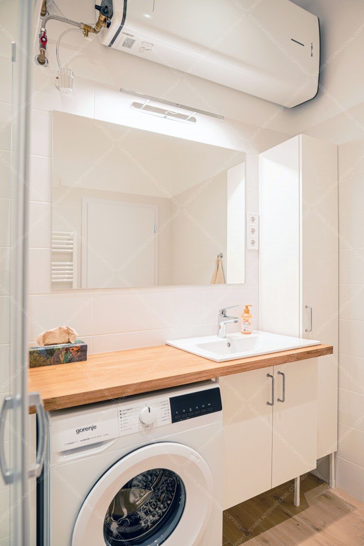 From here, a sliding door opens onto the half-room bedroom, and from the kitchen we enter the huge living room with two double windows, which also has a convector heater and air conditioning. The rooms have 3-layer wooden windows with shutters and mosquito nets. The bathroom with a large shower opens from the living room and has a 100-liter Ariston smart boiler, a programmable towel dryer, and a huge countertop with a Gorenje washing machine underneath. There are double sockets on every wall in every room, internet connection is available in both rooms, and cable TV is installed in the living room.